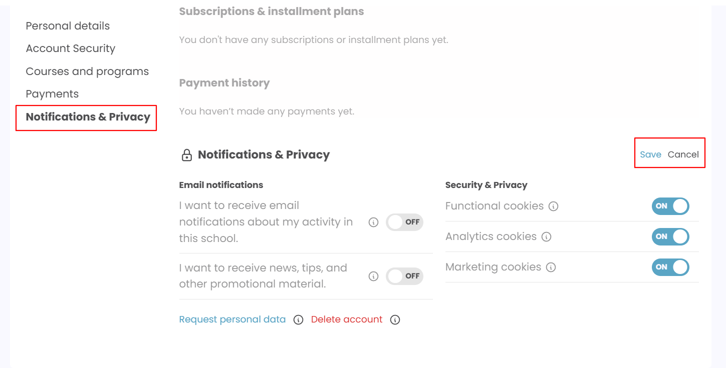 By activating this functionality, you give your users a choice to navigate to their profile page (users can click on Edit and then Privacy Settings → Advanced Privacy Settings and either request to have their data erased from the school or ask for their data report.