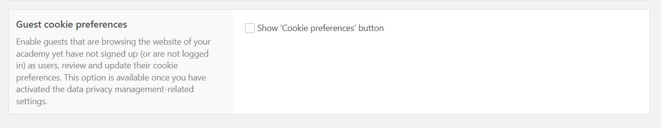Under Settings → School Settings → Privacy / GDPR you can also locate the Guest cookie preferences option. It aids in managing cookie preferences specifically for visitors to your school rather than users. Allows guests who are browsing your website yet have not signed up (or are not logged in) as users to review and update their cookie preferences. This option is available once you have activated the data privacy management-related settings.