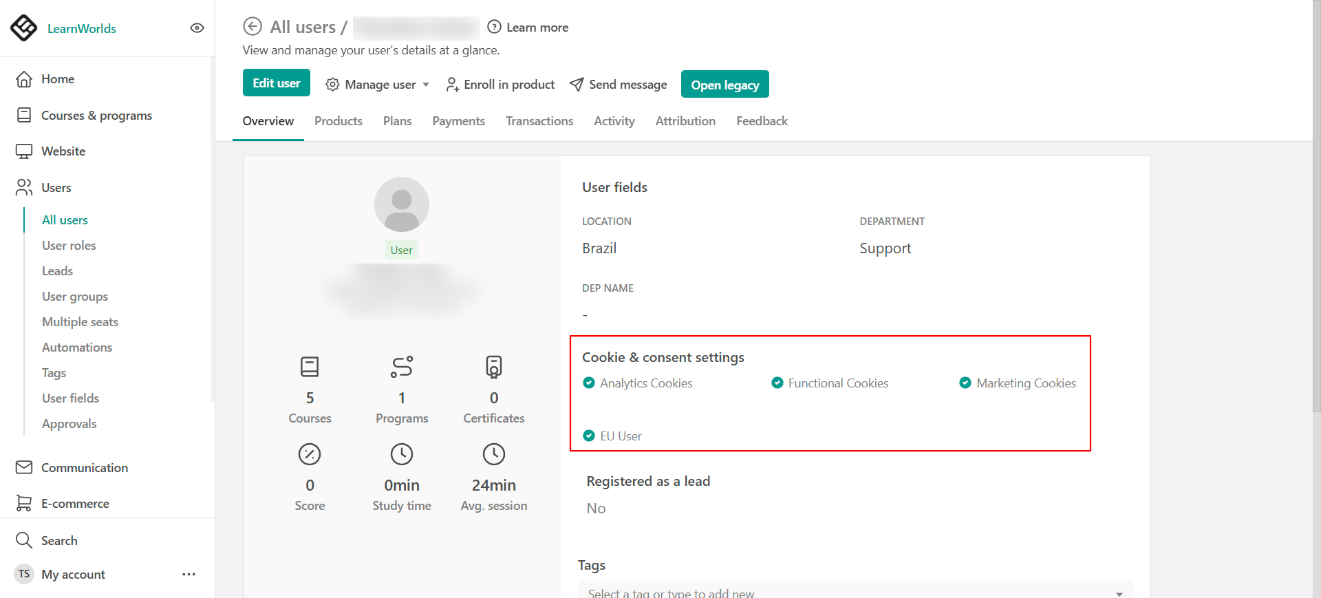 - Users Page: All the GDPR preferences and activated settings related to each user can be found by navigating to Users → All users and opening their User Card.