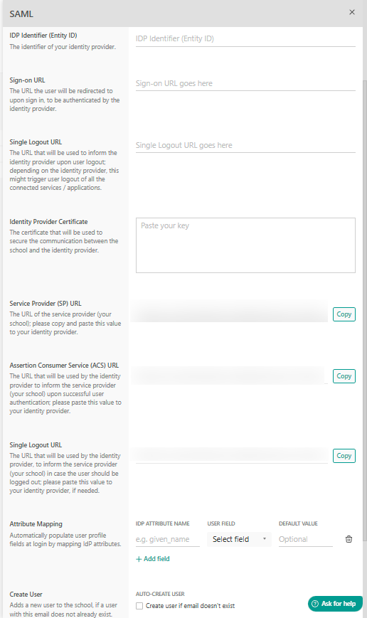 g. Single Logout URL: The URL that will be used by the identity provider to inform the service provider (your school) in case the user should be logged out; please paste this value to your identity provider, if needed.