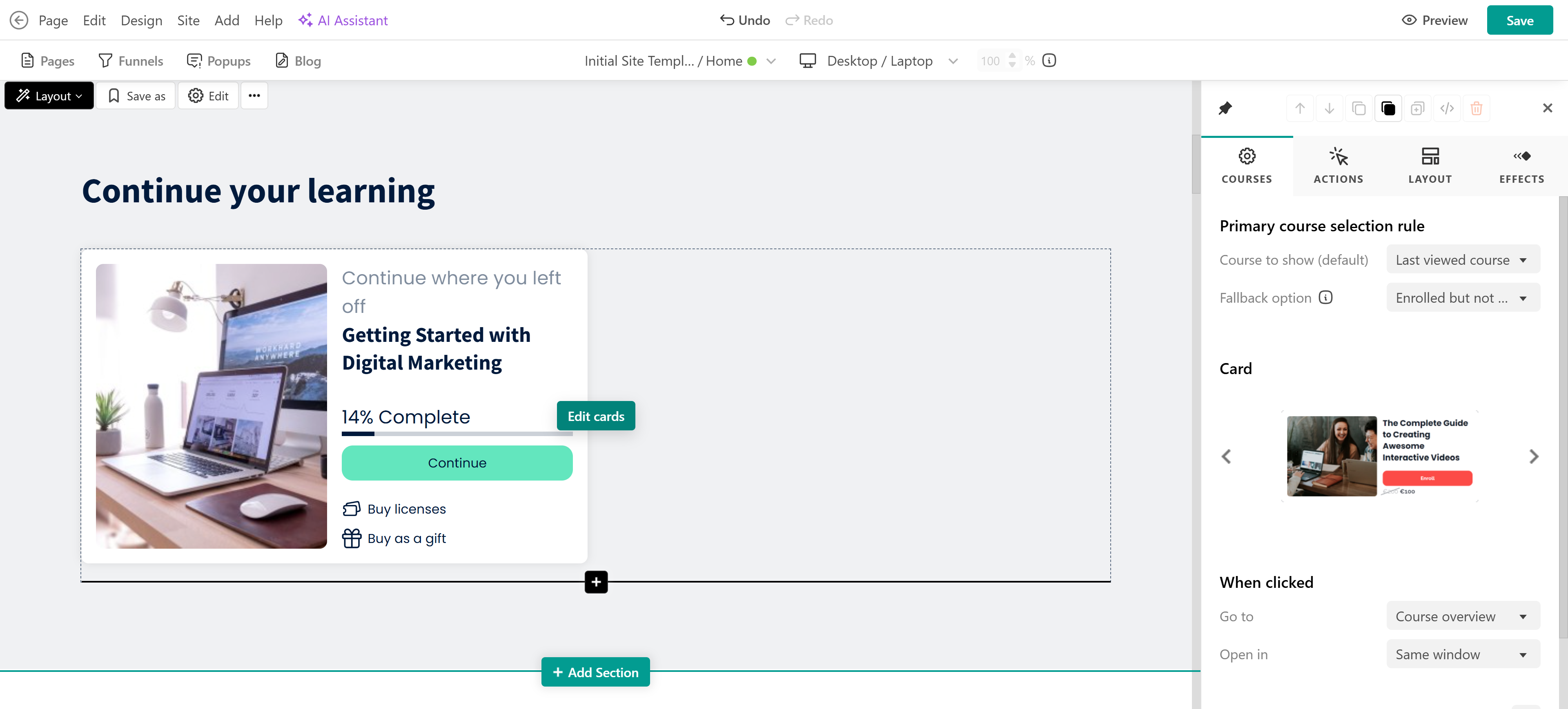 - Click Edit cards to choose the recommendation rules to show and fallback options (shown when no course matches the primary rule), select the cards' layout and appearance, and edit the options when clicked.