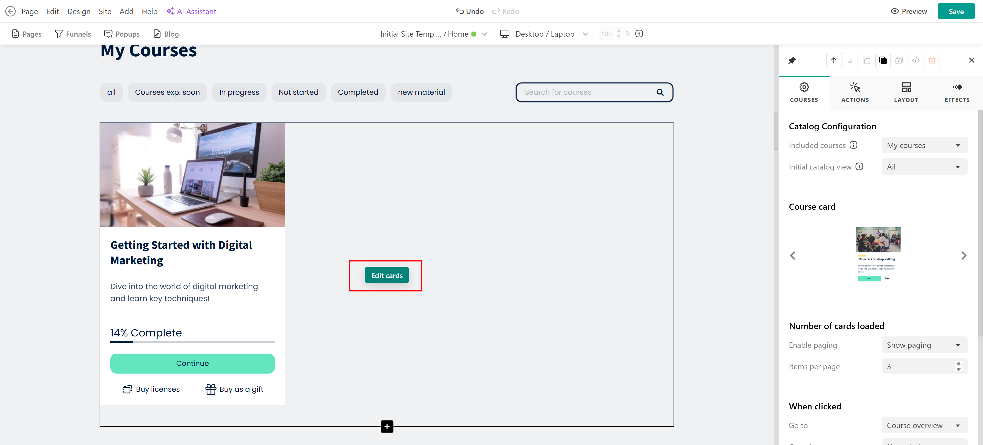 - Click Edit cards to choose the courses included (in catalog search) and initial options (appear as default), select the cards layout and appearance, edit the number of cards loaded, options when clicked, and the continue button.