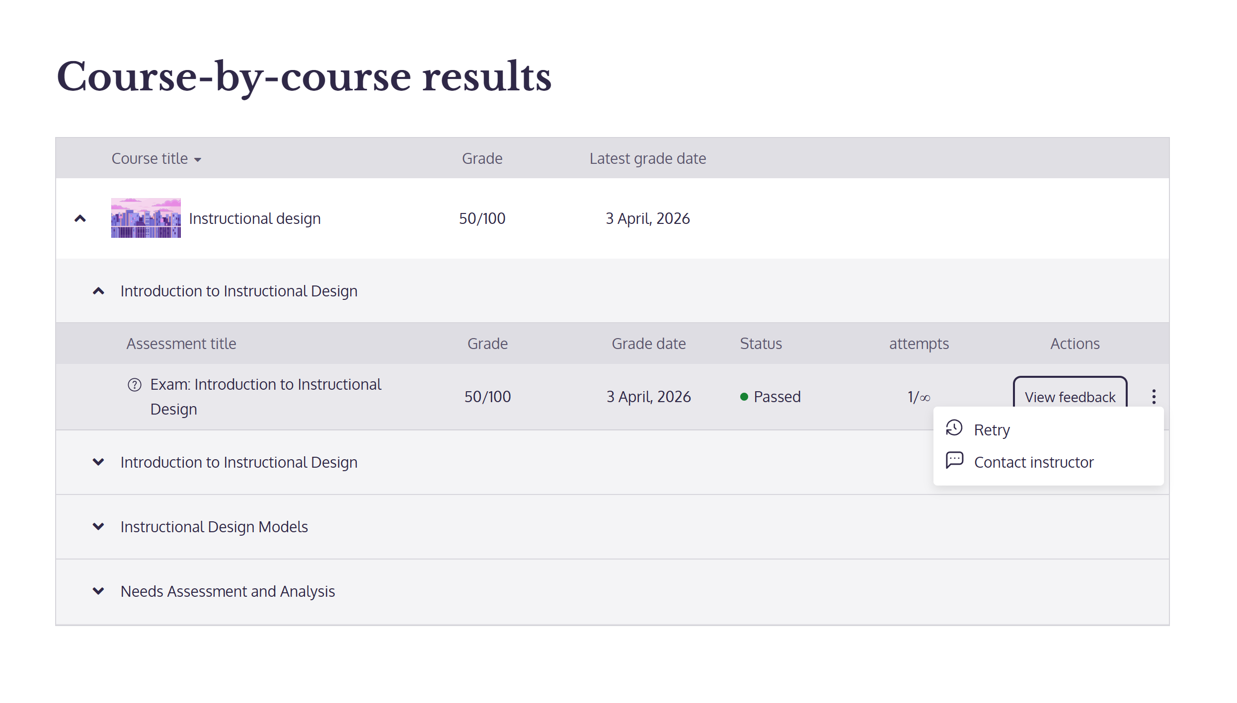 - Card actions (show retry, contact instructor, view feedback)