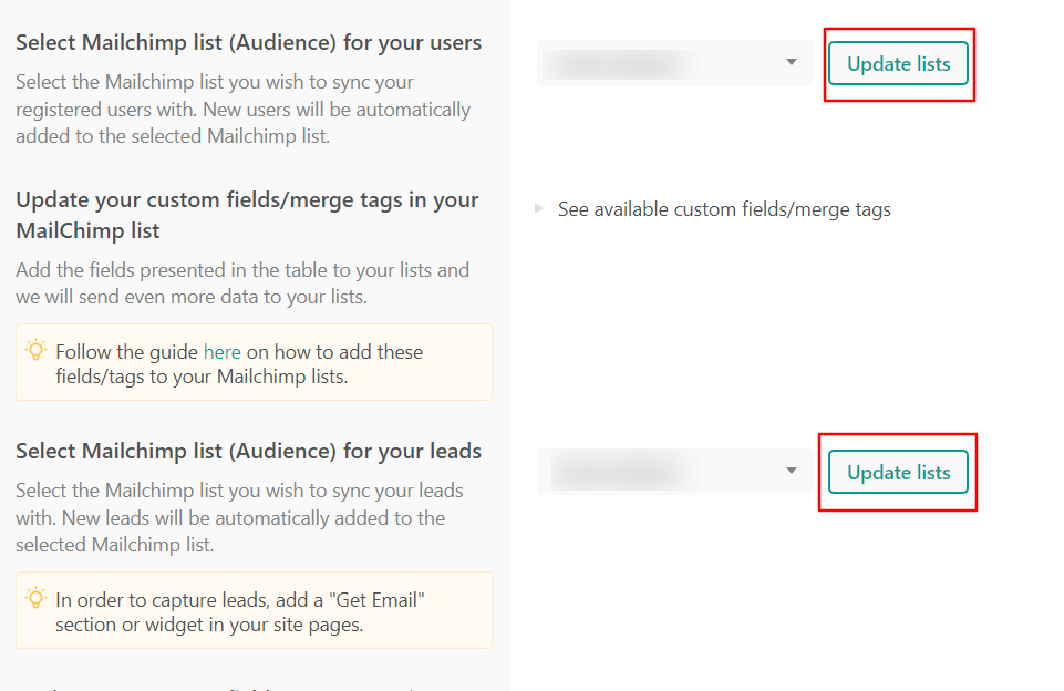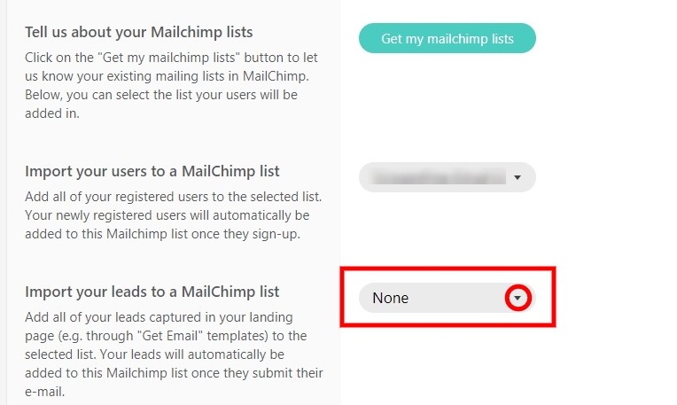 You can select the Mailchimp lists created for your users and leads captured on your pages (through email grabbers sections).