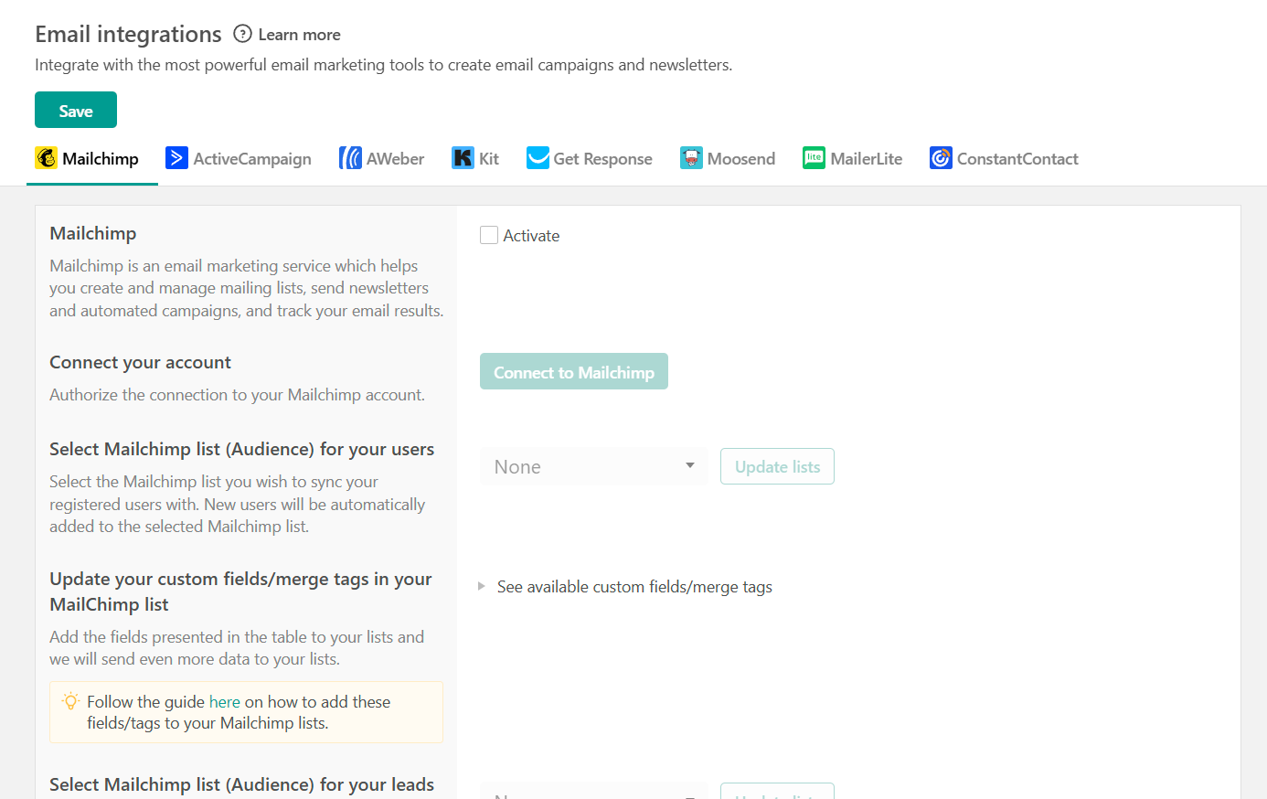 B. Leads Custom Fields: LearnWorlds allows syncing the information set for each lead with Mailchimp. This information is a mix of activity and systemic fields, populated as a result of the lead’s activity while subscribing from within email grabbers and UTM fields.