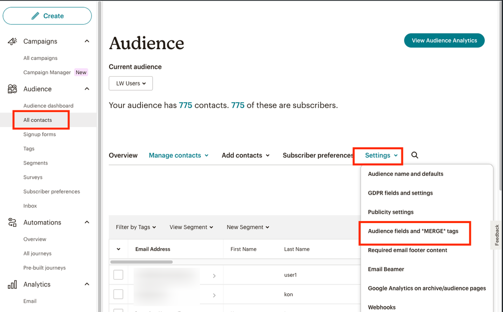 To check your fields in Mailchimp, go to Audience → All contacts → Settings → Audience fields and merge tags.