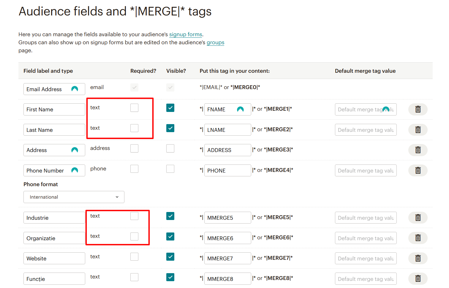 - The fields in MailChimp should be in text format, and they should NOT be set to required.