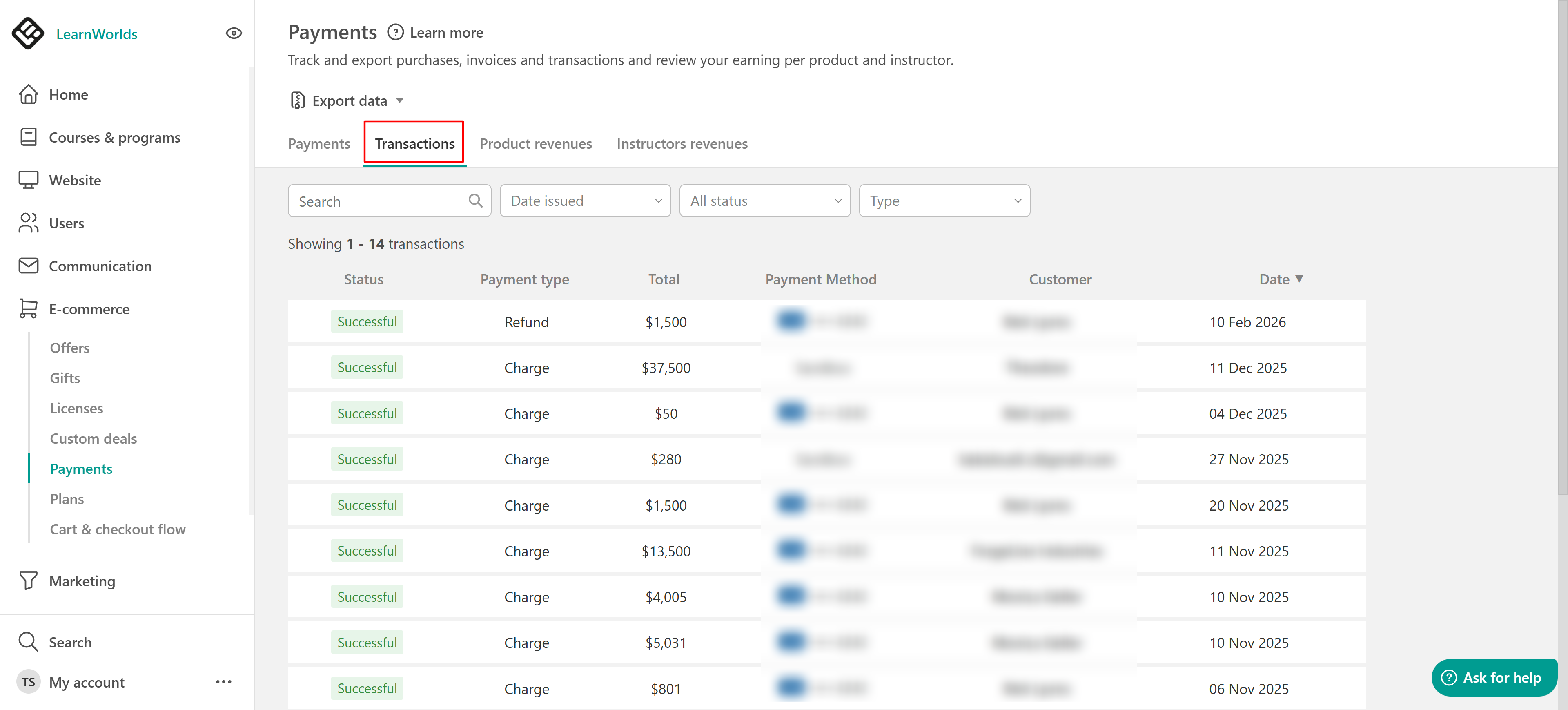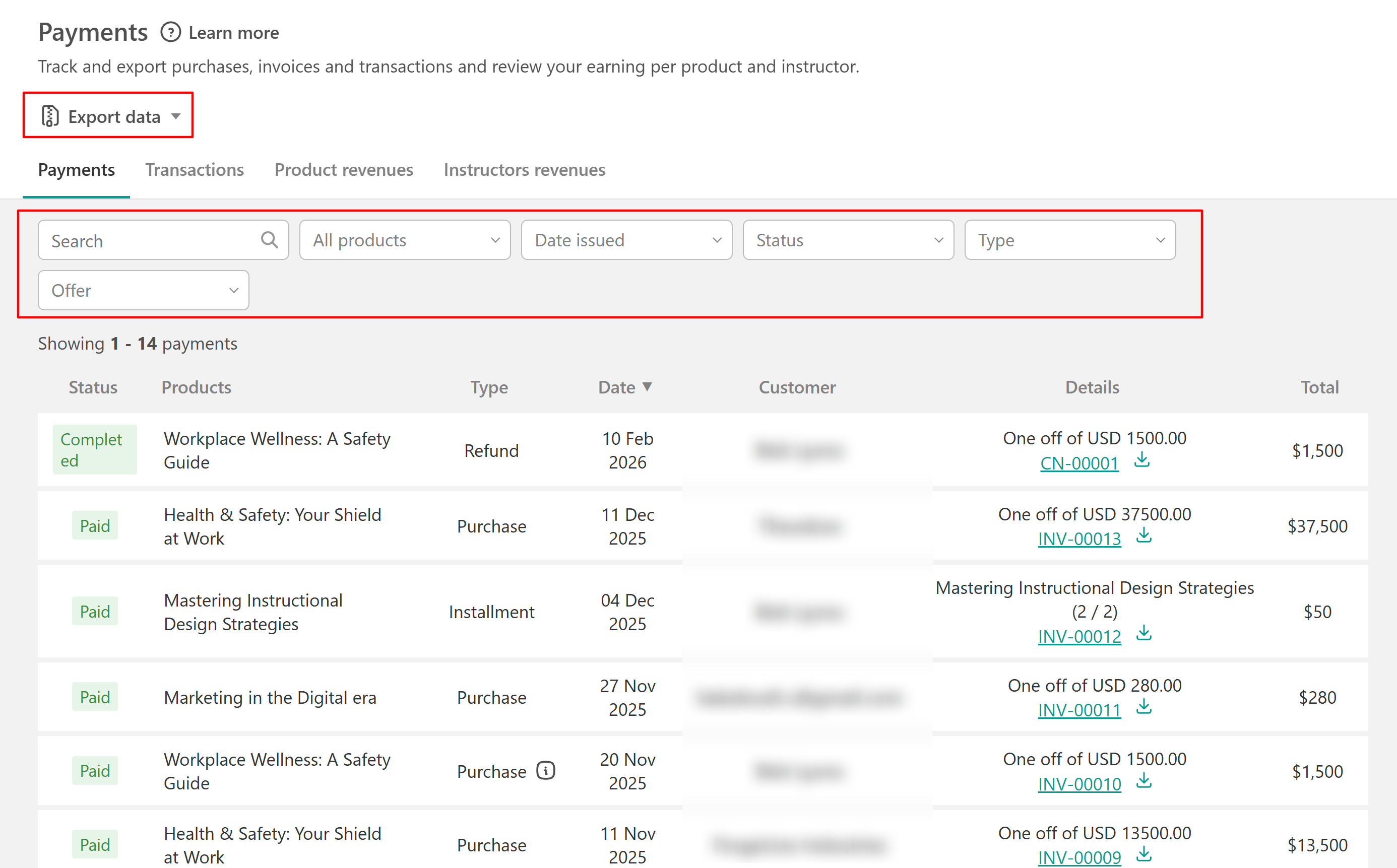 Payments is your central hub for managing all financial activity in LearnWorlds. Review purchases, subscriptions, refunds, and revenue by product or instructor. You can also handle overdue invoices, issue refunds, troubleshoot failed transactions, and export data in CSV or XLS format.