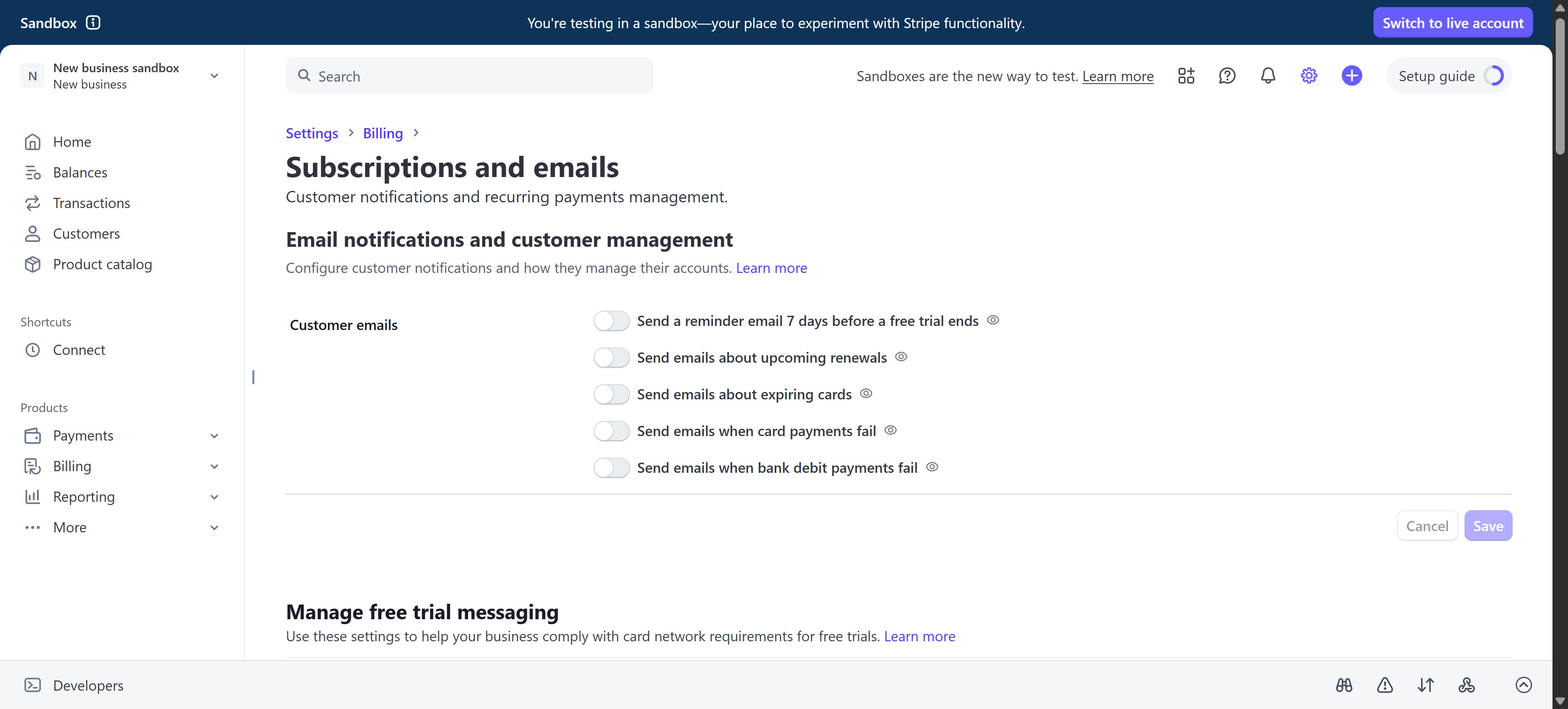 1. Log in to your Stripe account and navigate to Settings → Billing → Subscriptions and Emails.