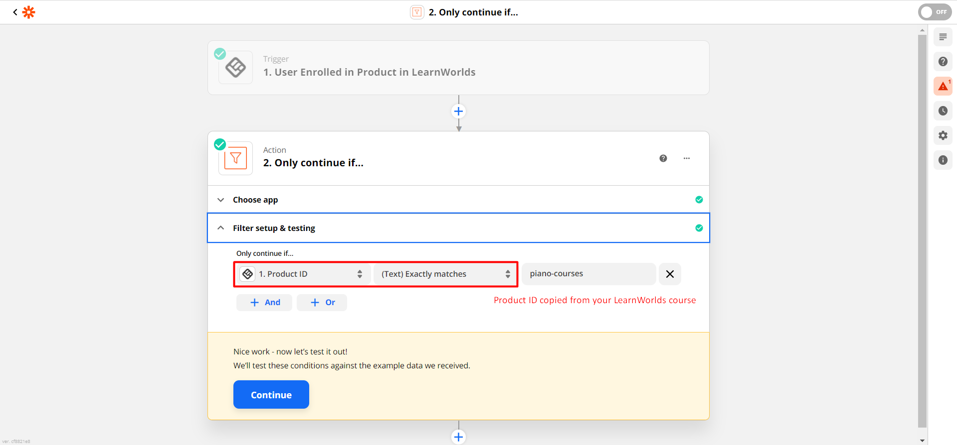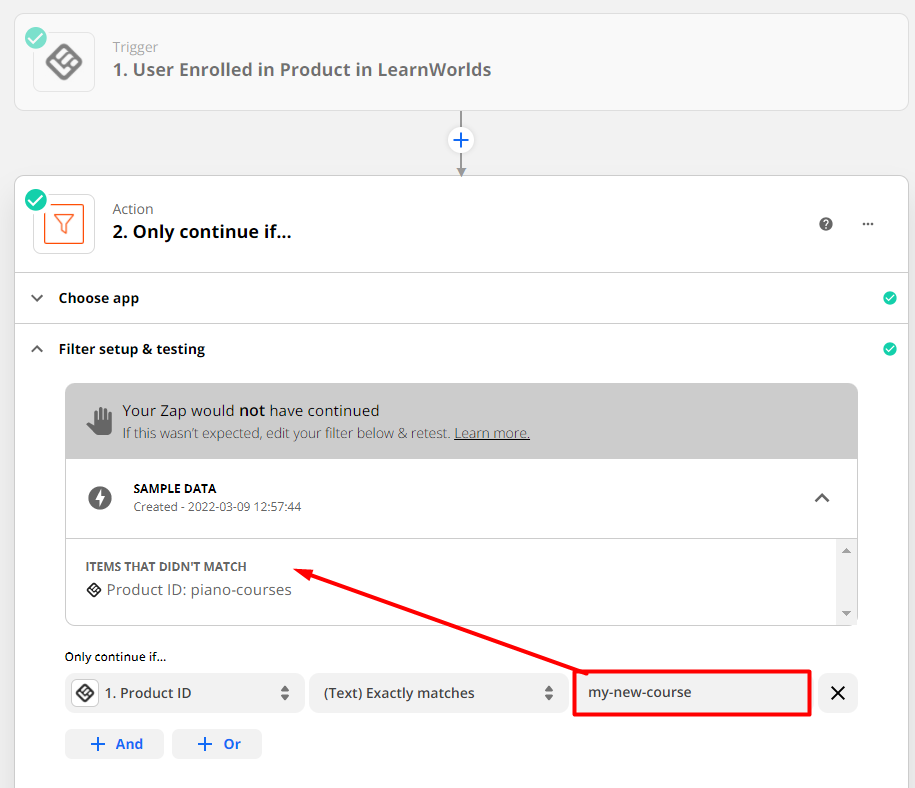 If you wish to act on your users based on their enrollment to a specific LearnWorlds product, you can add a filter action. When adding a filter to a Zap, for example, in the Trigger User Enrolled in Product, to add a filter to categorize the Product, you should use the "Product ID" variable + (Text) Exactly matches + "Product ID". For more information on how to find the Product ID in your school, click here.