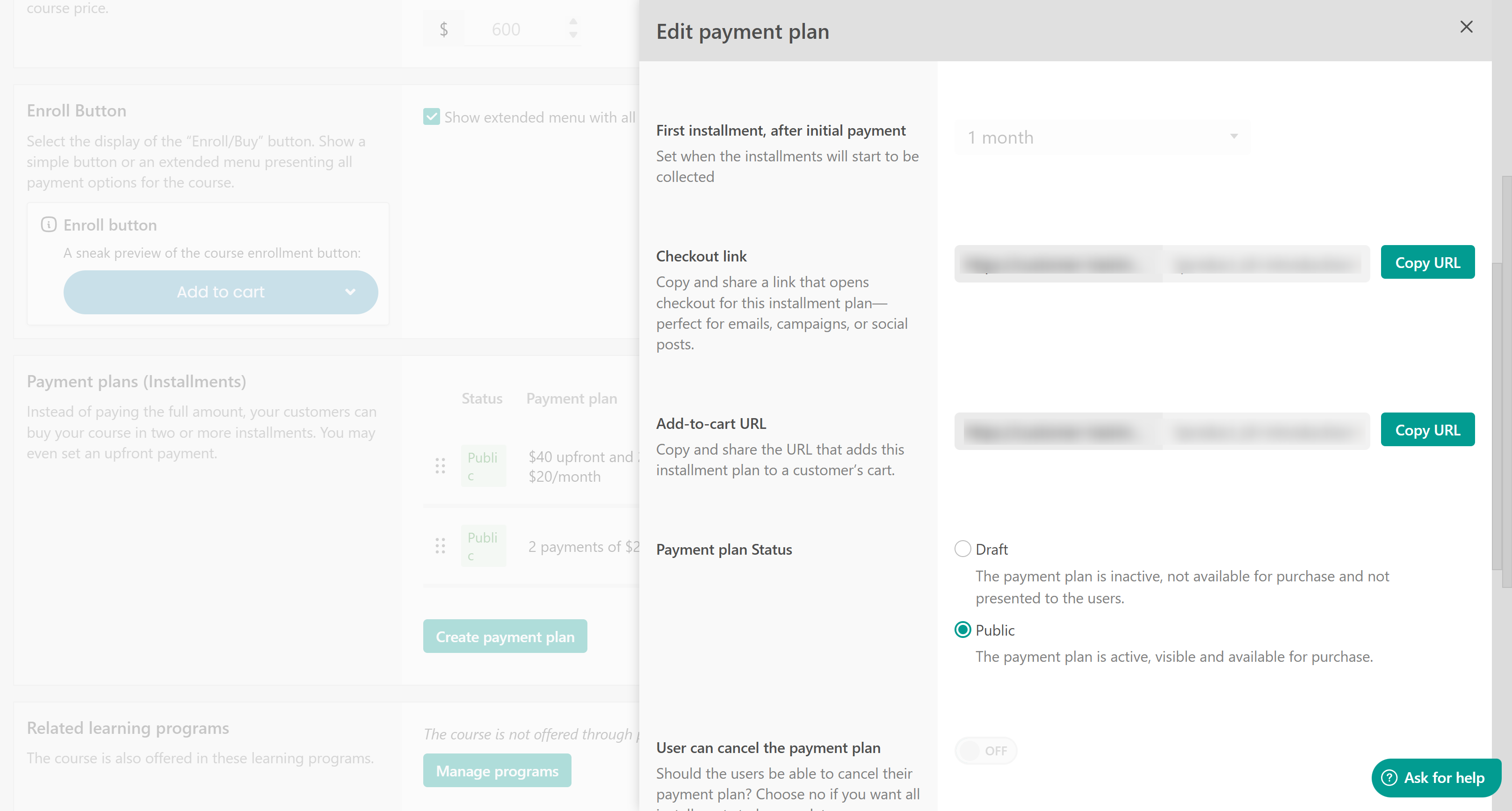 - If you set an existing installment plan's status from Public to Draft, it will get archived. This means that the payment plan is not available for purchase anymore for new users, but already enrolled users will keep getting billed.