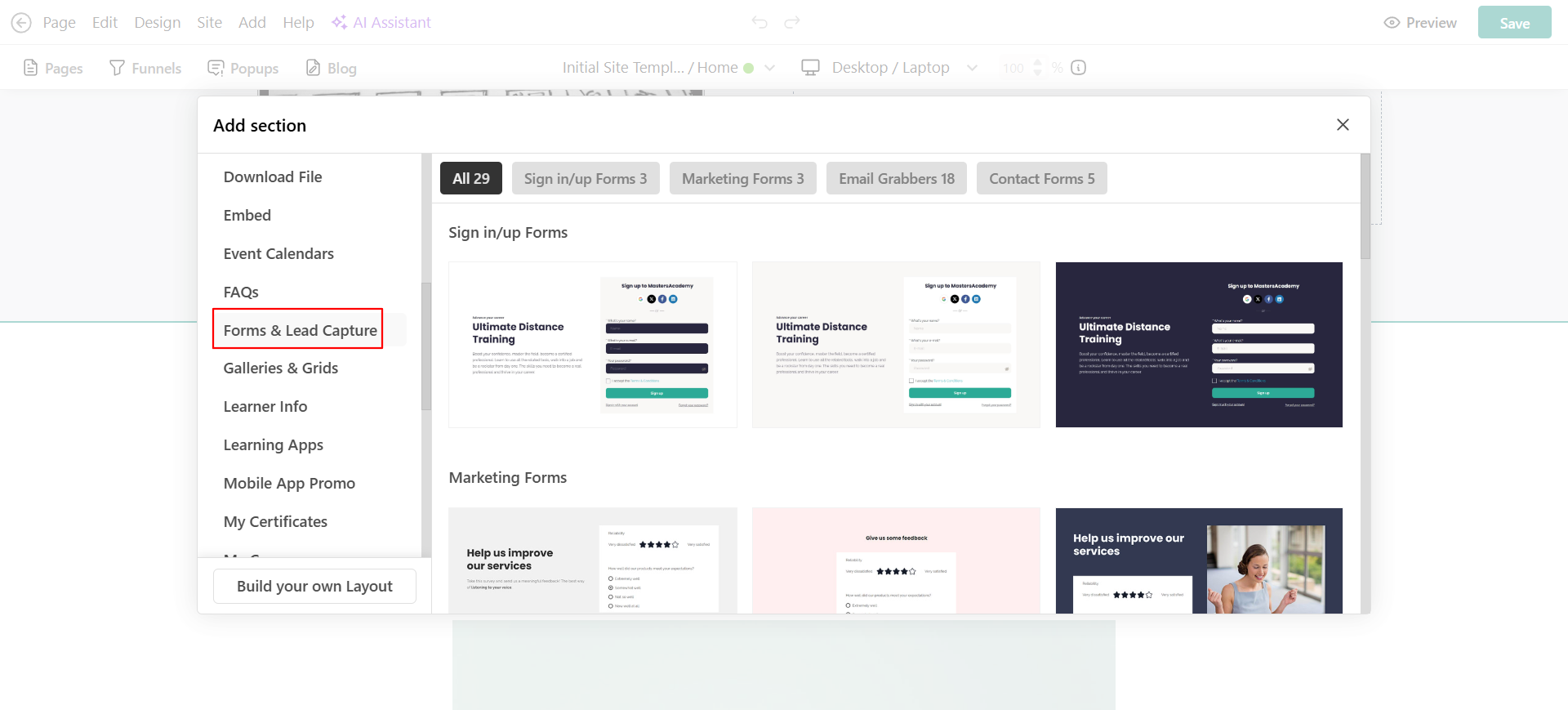 3. Click on +Add section and select forms & lead capture to add one of our available Contact Forms Section.