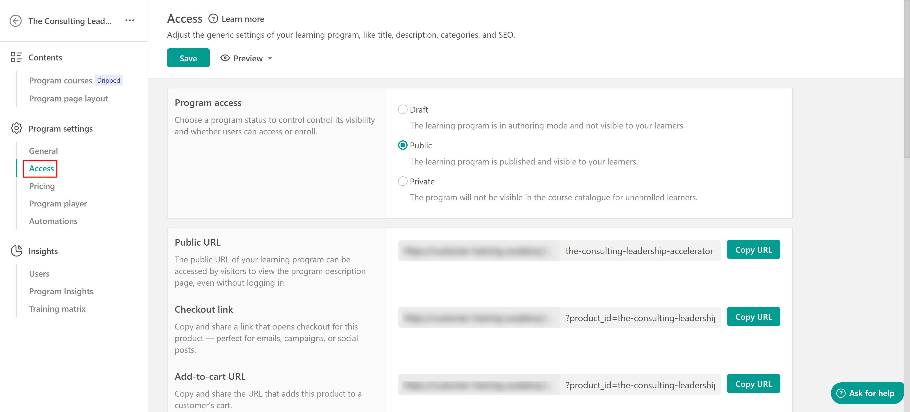 Choose the Program access, which can be set as Draft, Public, or Private. Use Draft mode (not available to purchase) when developing your program, set it as Public when you want to make it available in your school, and Private when you don't want users to locate and purchase it on their own but prefer to manually enroll them instead.