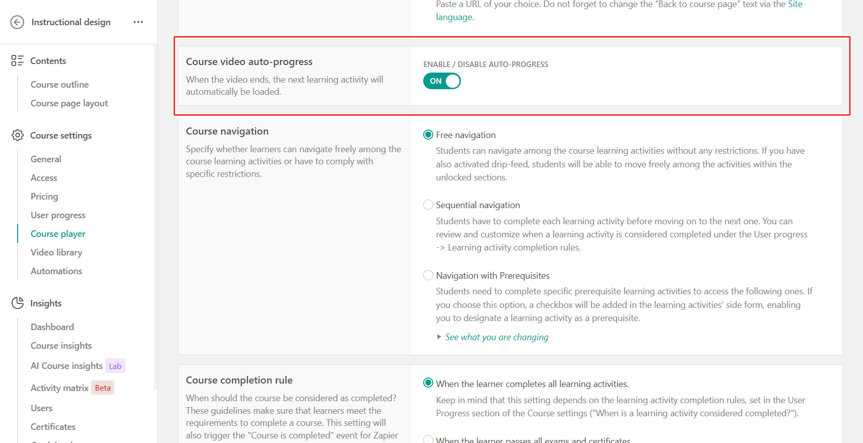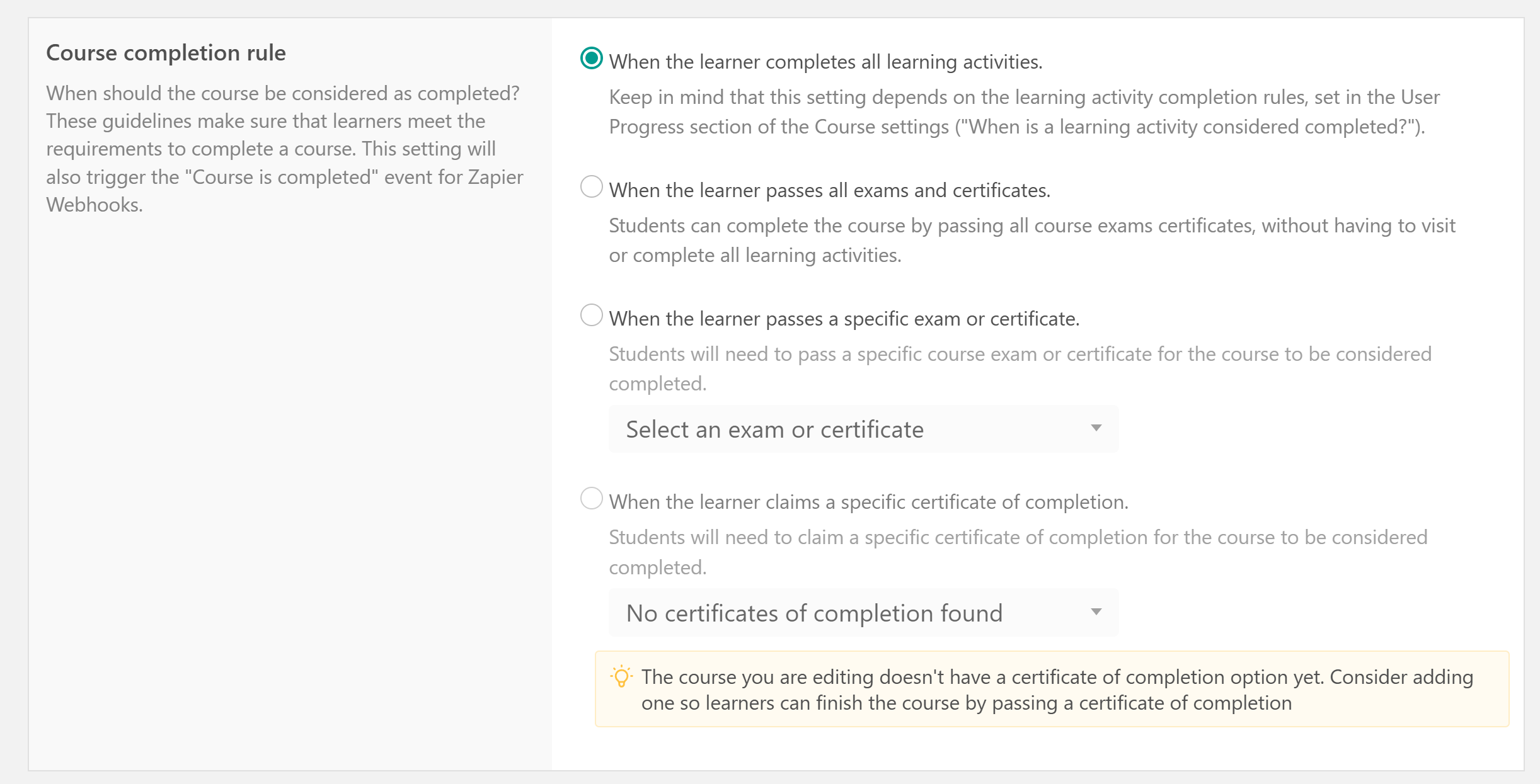 With this setting, you decide when should a course be considered as completed. These guidelines make sure that learners meet the requirements to complete a course. This setting will also trigger the "Course is completed" event for Zapier Webhooks.