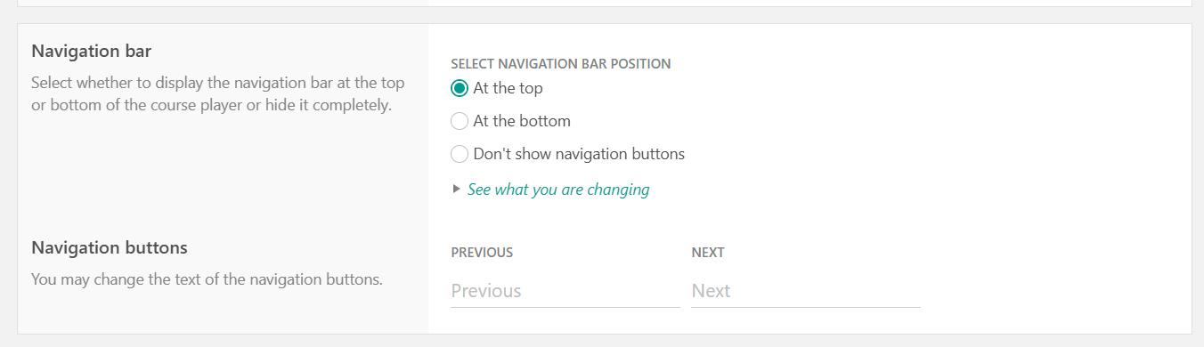 You can rename the Navigation buttons, hide them, or show the next/previous navigation buttons at the bottom of the course player. Additionally, you can disable the Sidebar navigation.