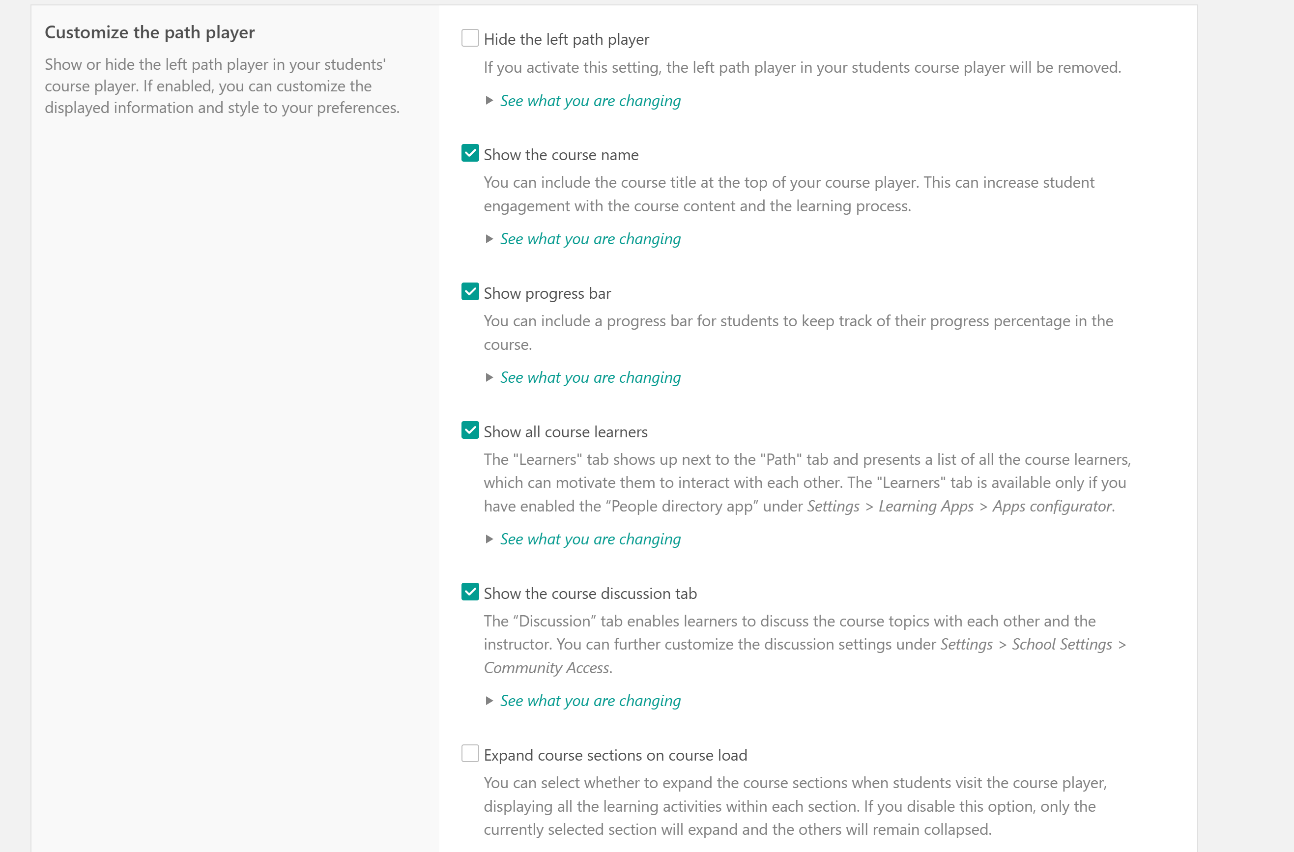7. Expand course sections on course load. You can select whether to expand the course sections when students visit the course player, displaying all the learning activities within each section. |