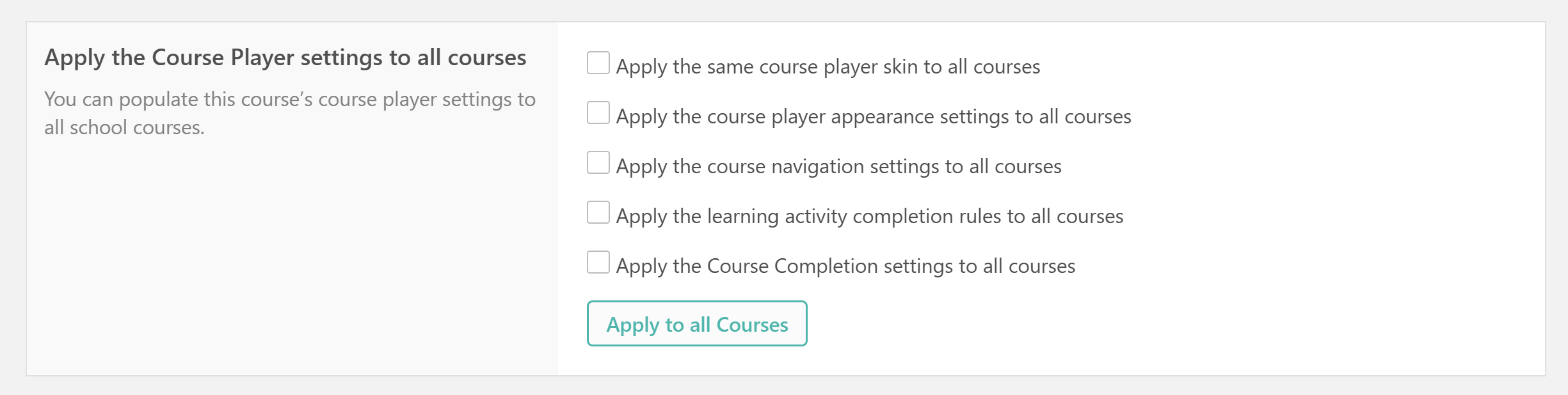 - If you wish to apply the Course Player settings to all of your created courses, check the relevant settings under Apply Course Player settings to all other courses.
