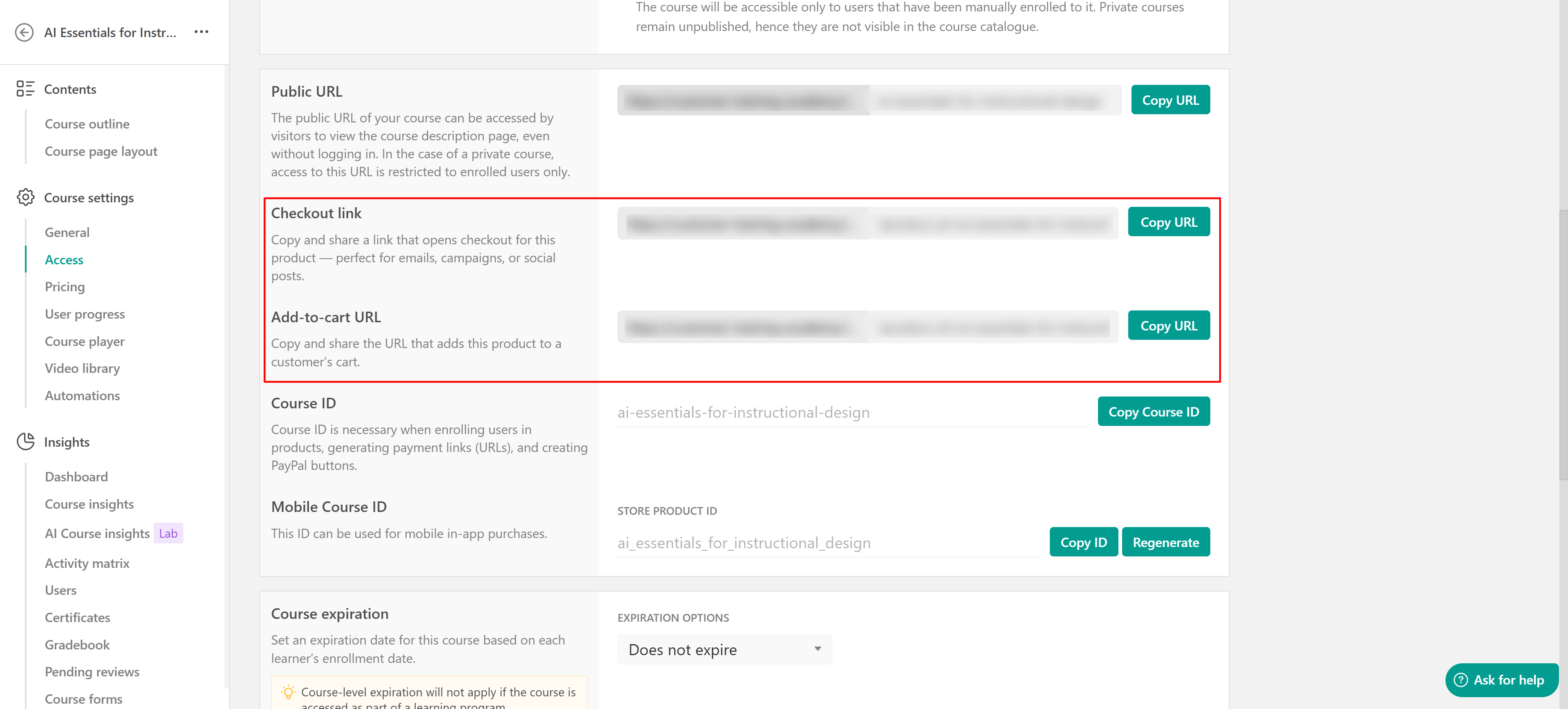 To simplify enrollment, you have the option to generate checkout URLs. These URLs enable the sharing of free or paid access to these courses without the need for manual enrollment.
