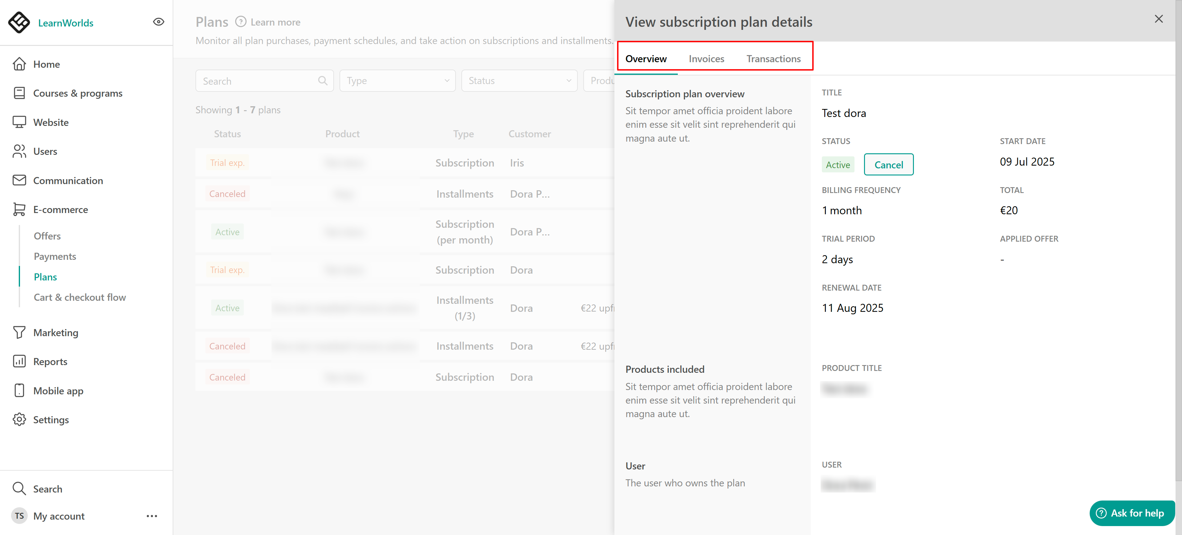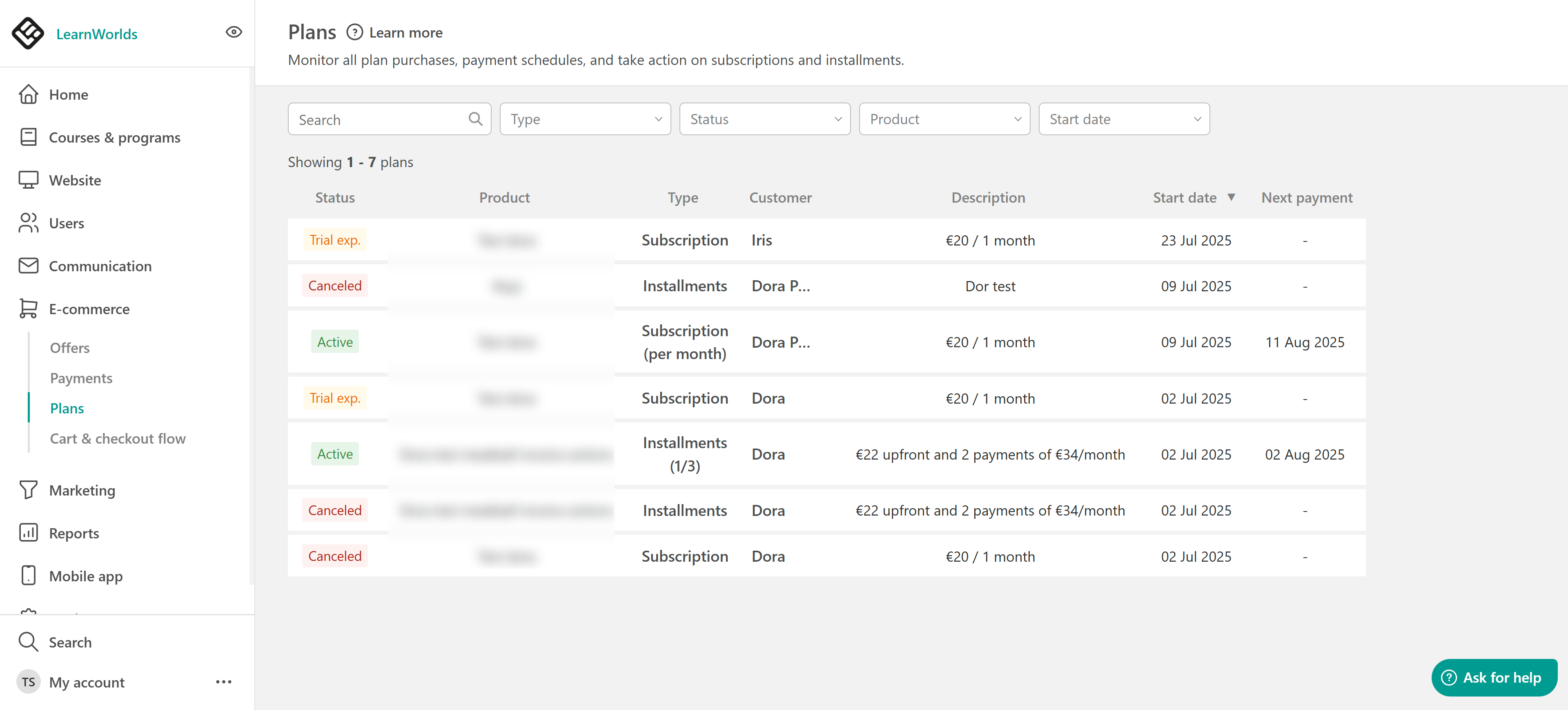 The Plans tab in your admin dashboard gives you a complete overview of all user subscriptions and installment plans across your school. In the plans page, you can monitor, review, and manage user subscription and installment plans directly from LearnWorlds; no need to log into Stripe.