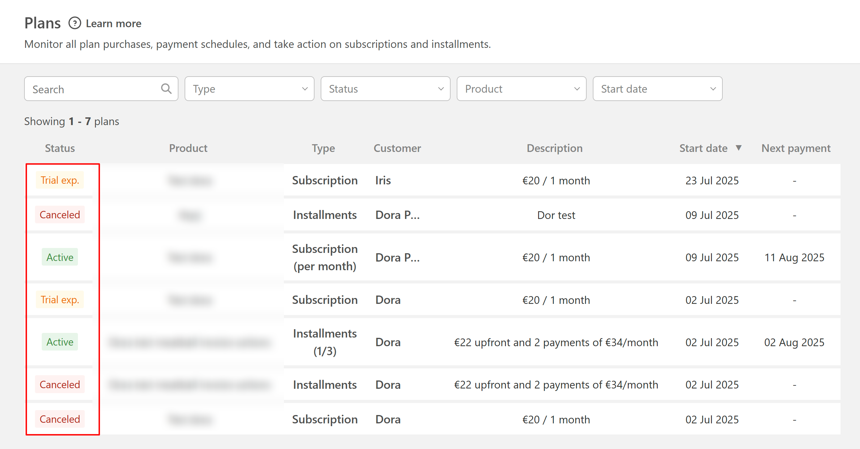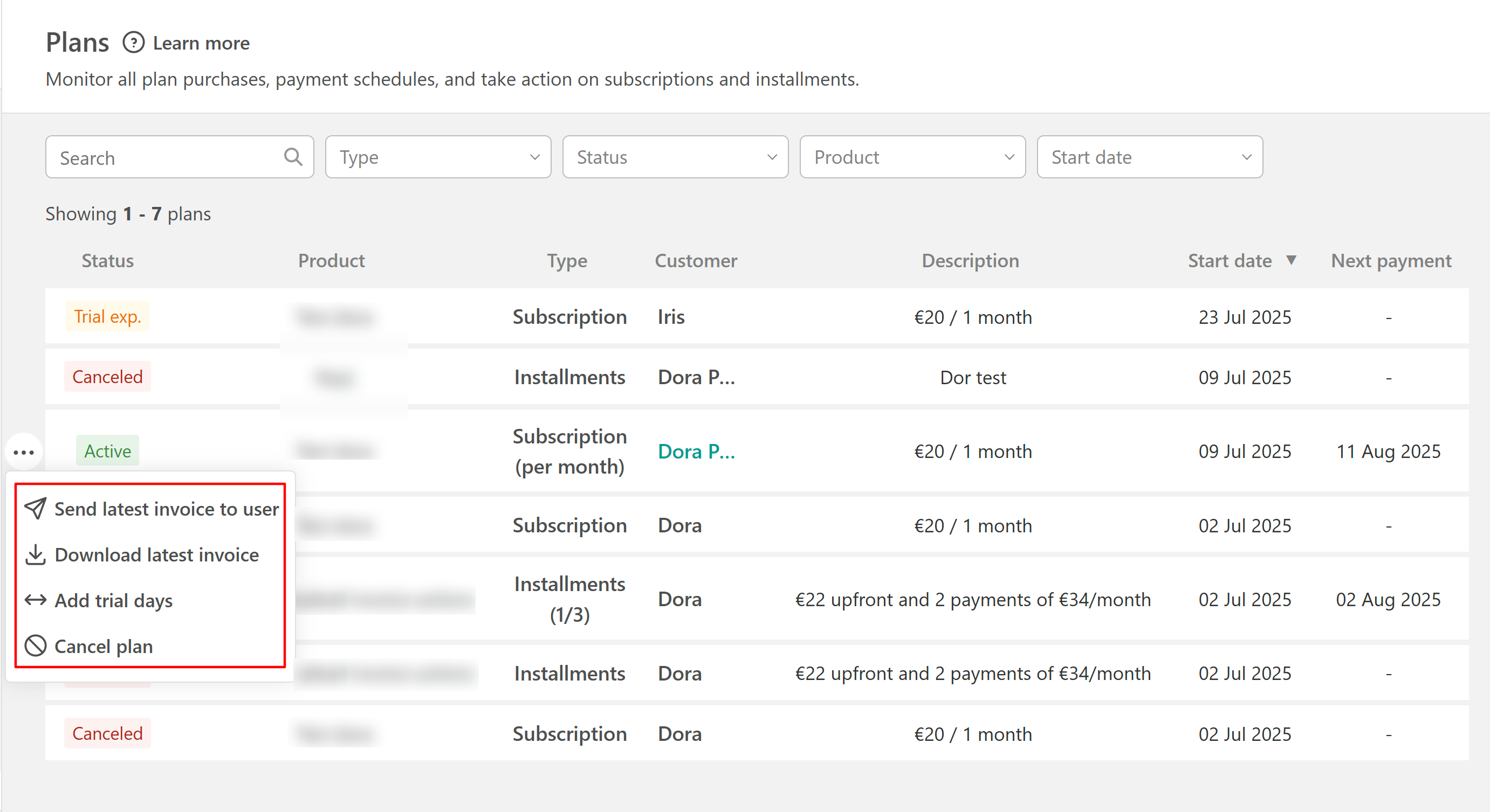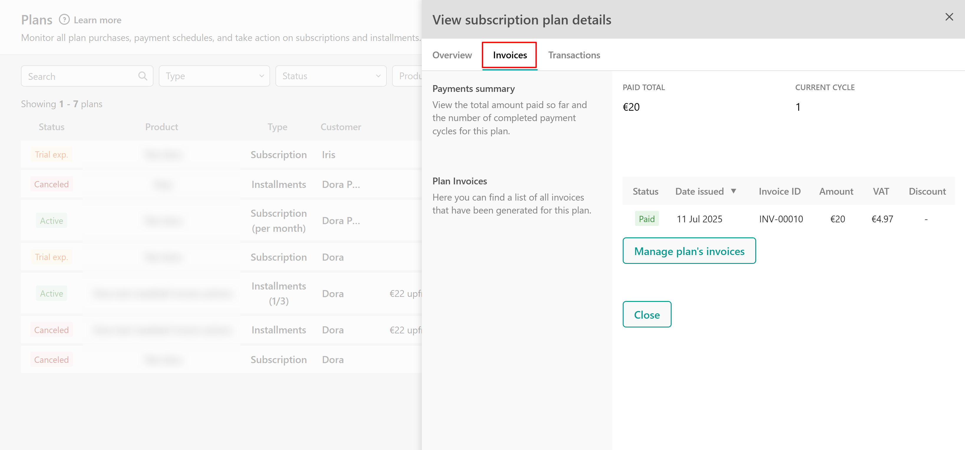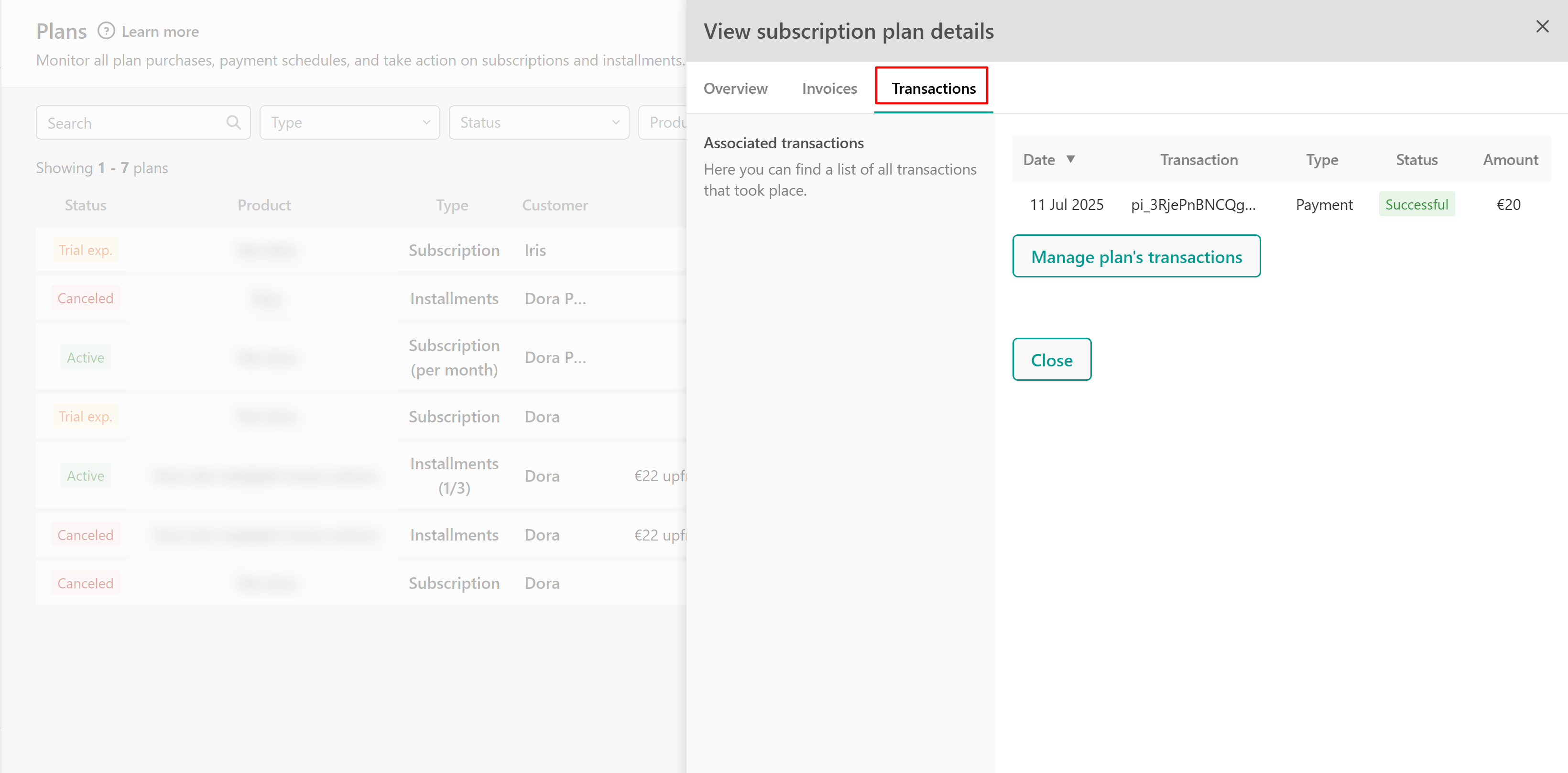 In this article, we will learn how to navigate the Plans tab, filter and understand subscription and installment plan details, view and manage individual plan information, and perform actions on subscriptions or installment plans.