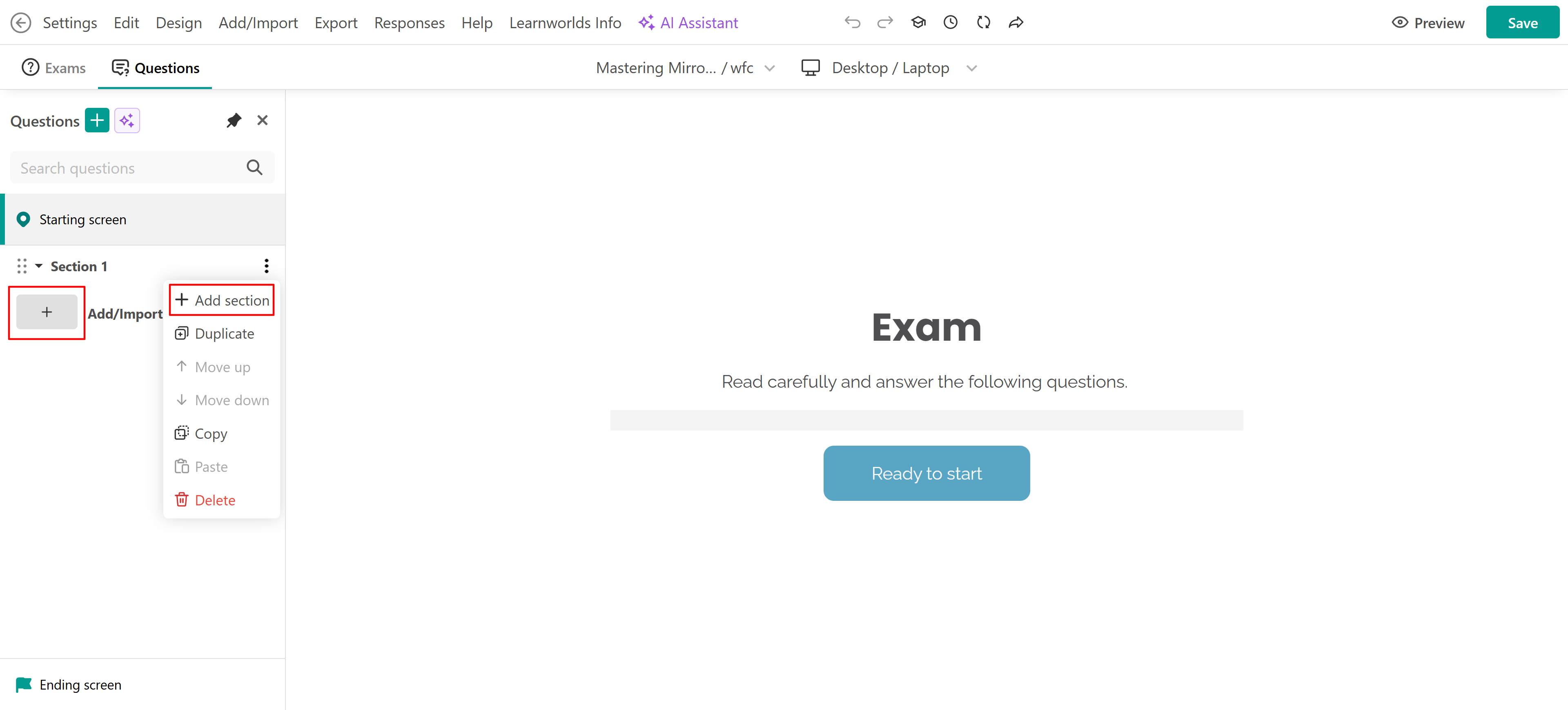 You can enable the respective settings under Settings → Randomize to randomize and shuffle the questions in each section. Additionally, you can alter the name of the section if needed.