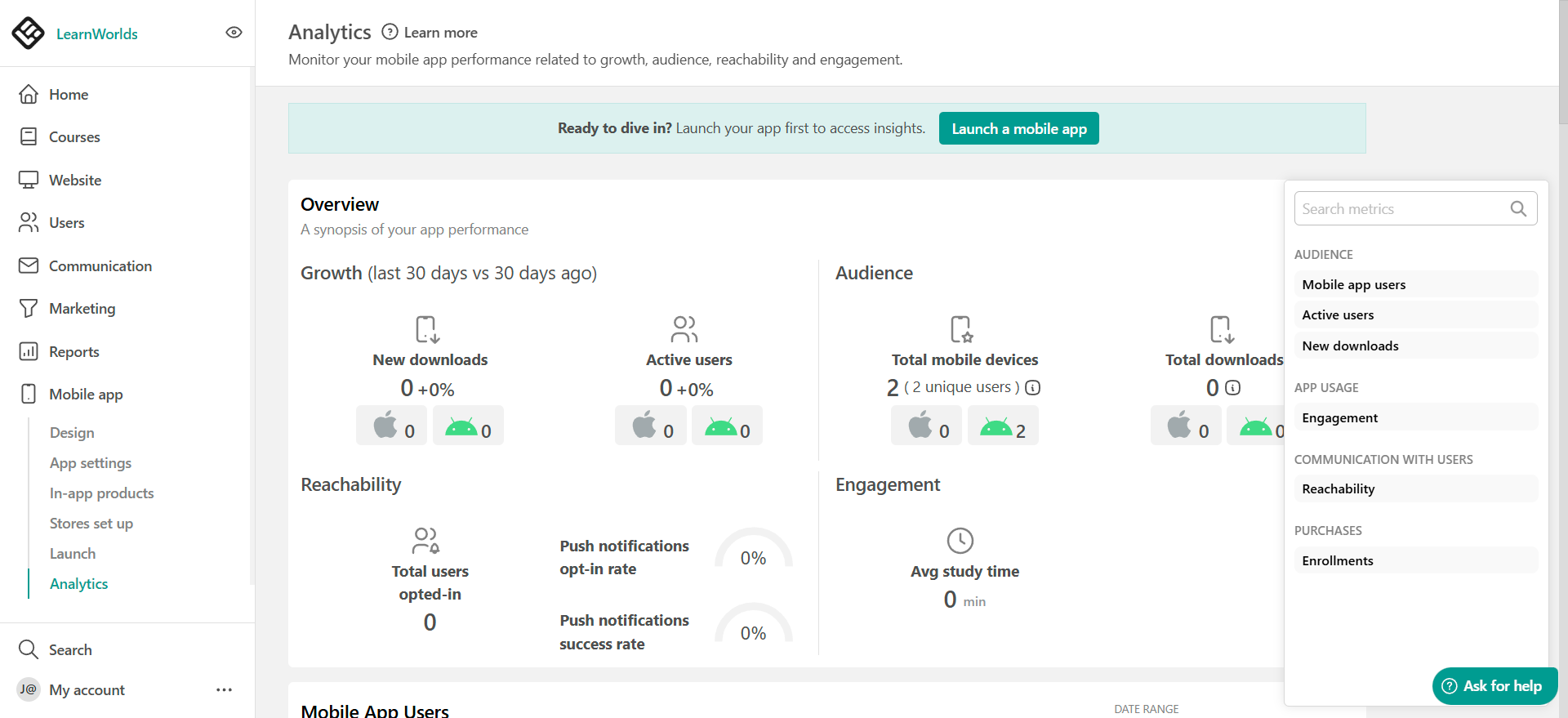The Mobile Analytics Dashboard provides a quick overview of the most important metrics related to your school’s mobile app. It allows delving into these metrics in a detailed manner and viewing how they fluctuate over time.
