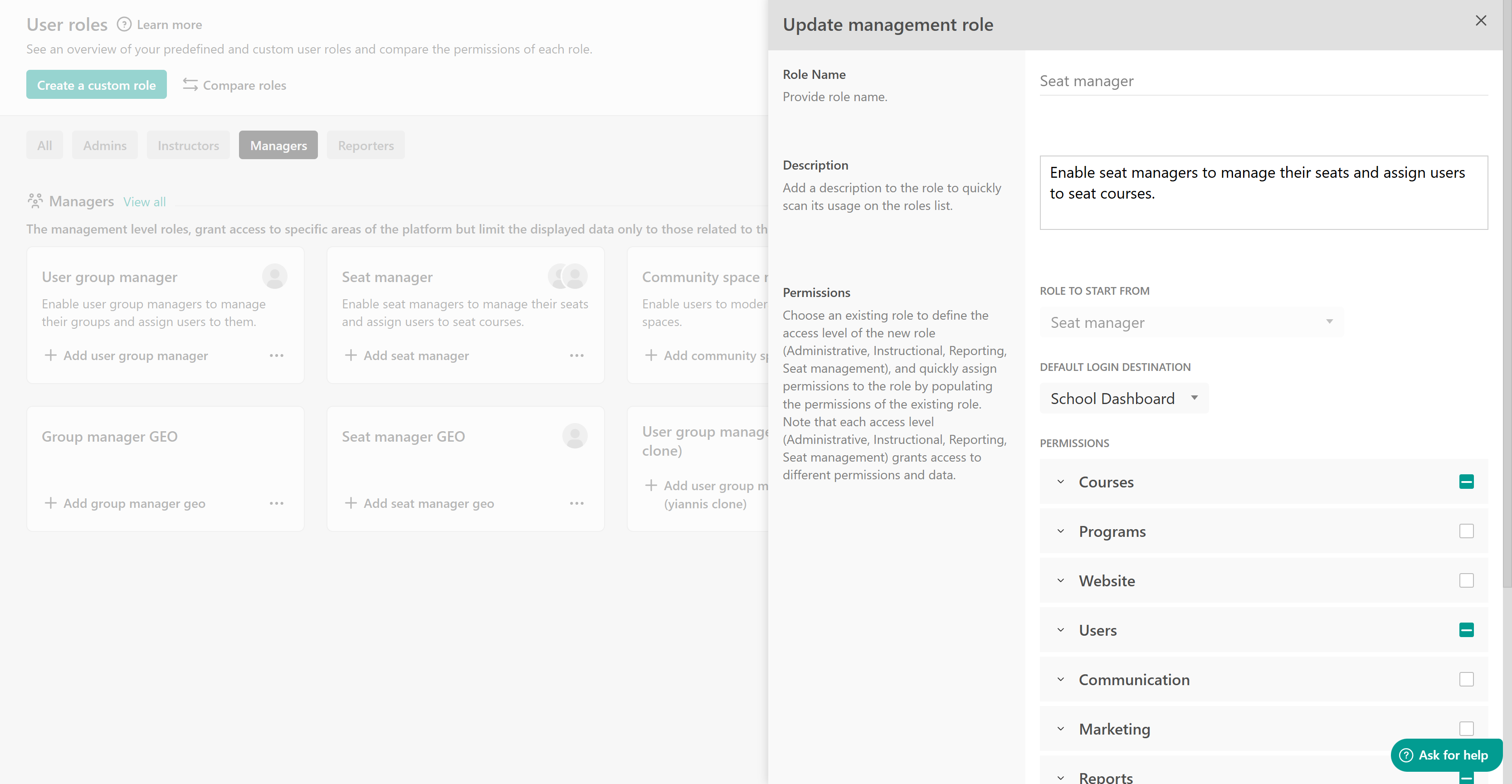 We provide one Predefined Seat Manager Role; however, it is also feasible to create Custom Roles (available on the Learning Center plan and above) with the aforementioned seat management permissions. Users with the Predefined role can manage their assigned Seats and/or User Groups, add users to the relevant seat or user group, and enroll them in the relevant courses.