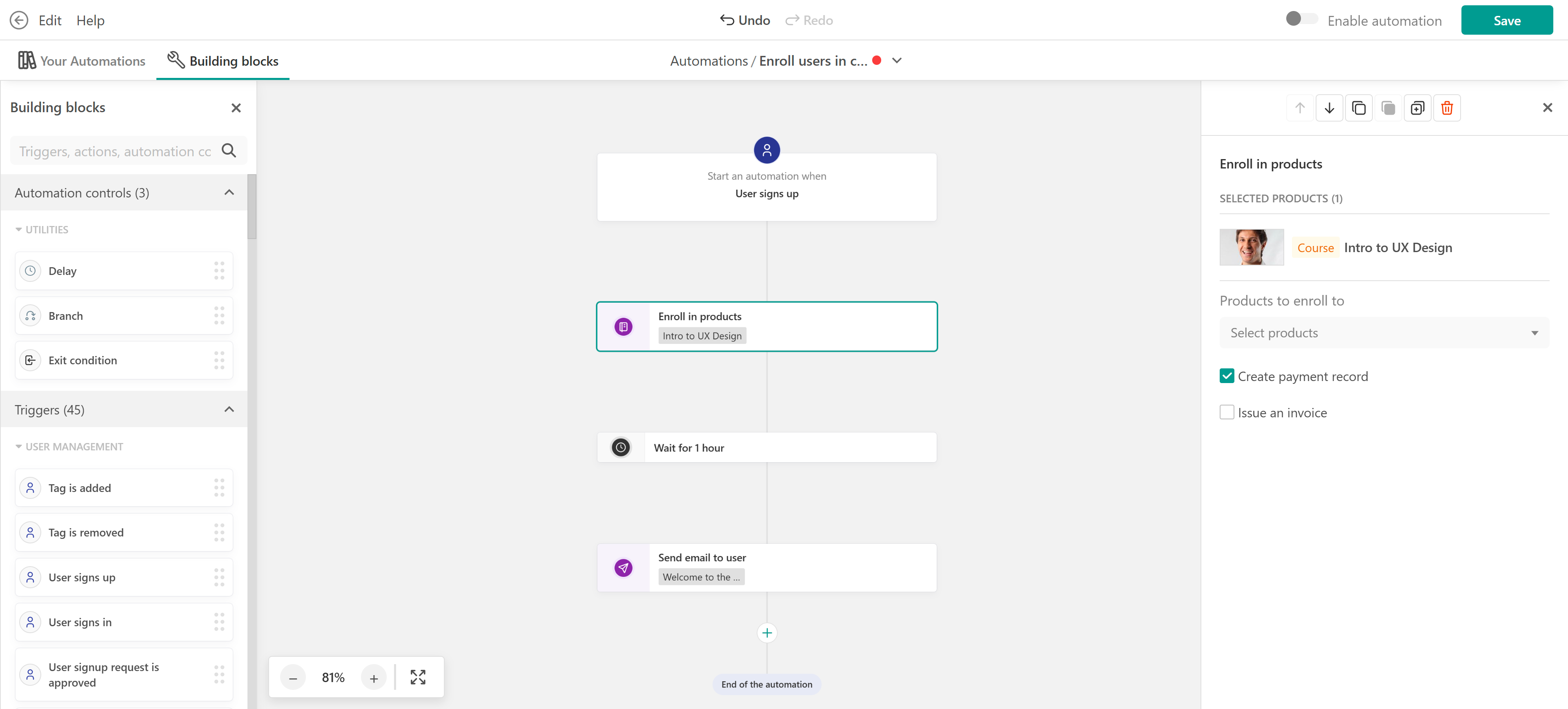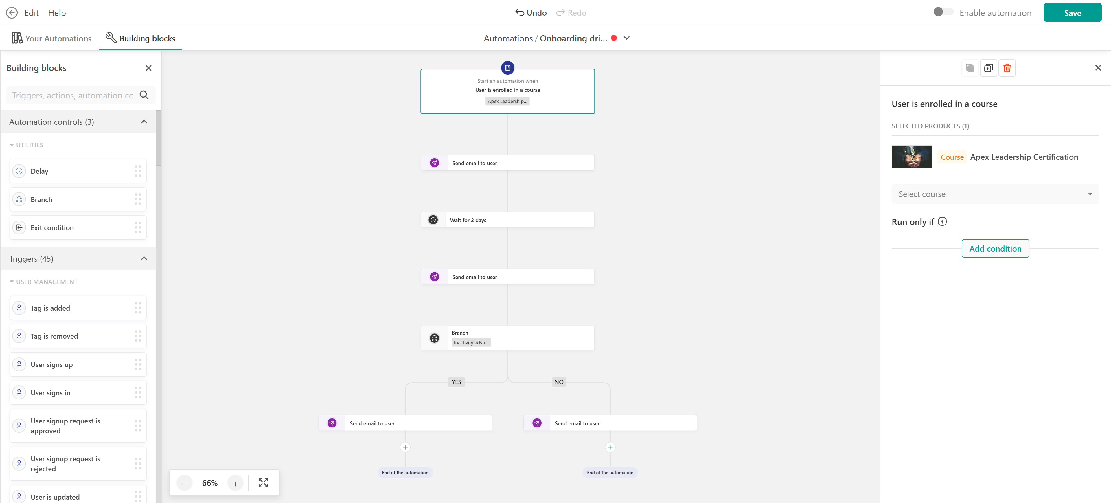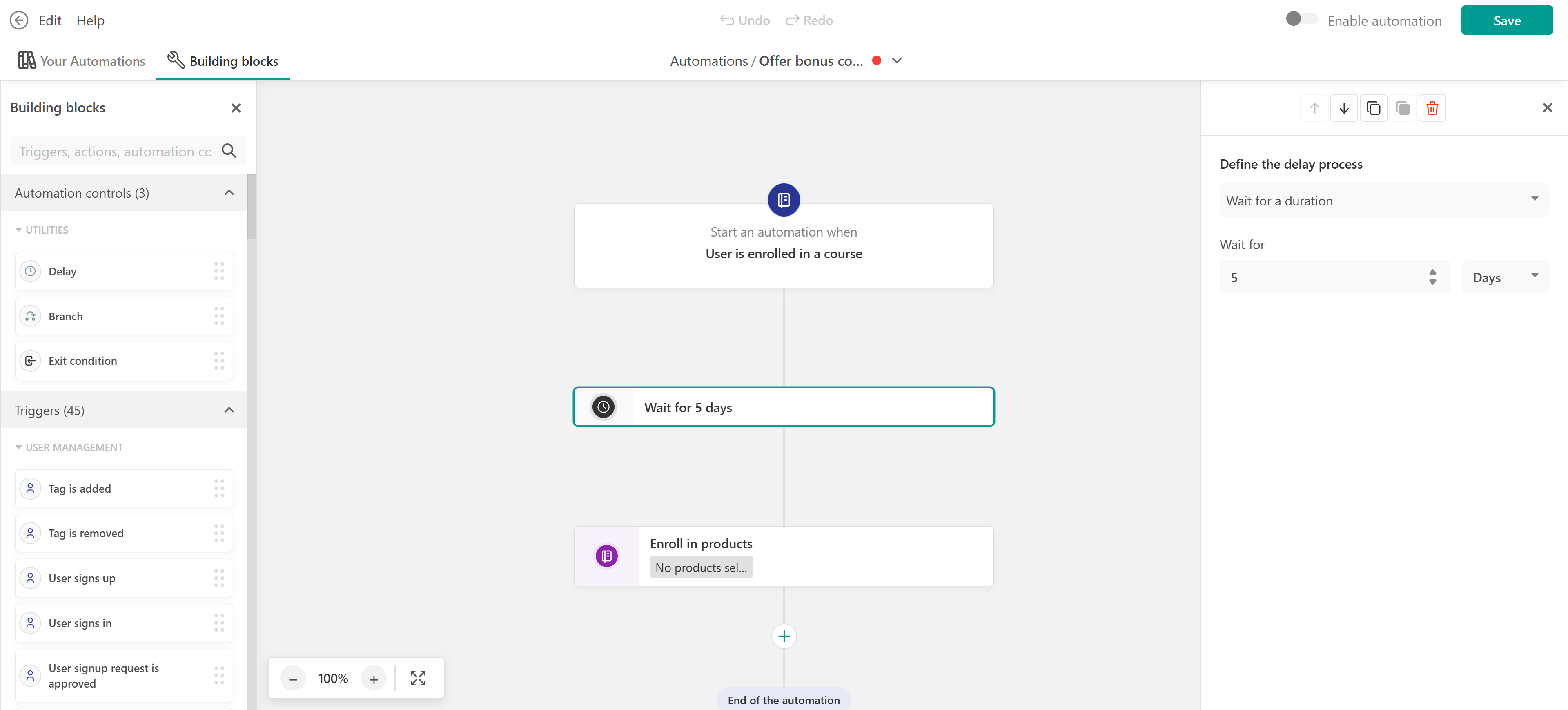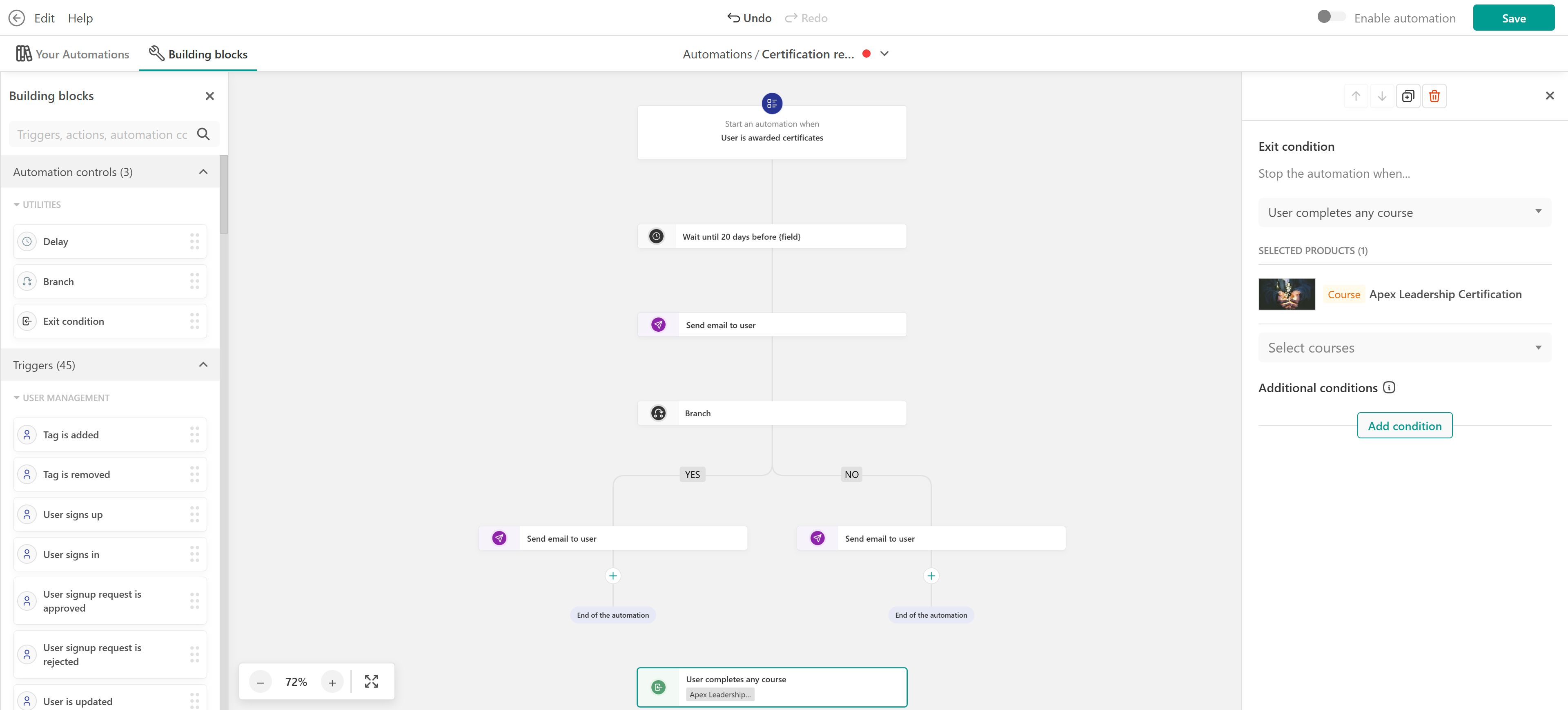 - Exit condition: Stop the automation if the user completes the course