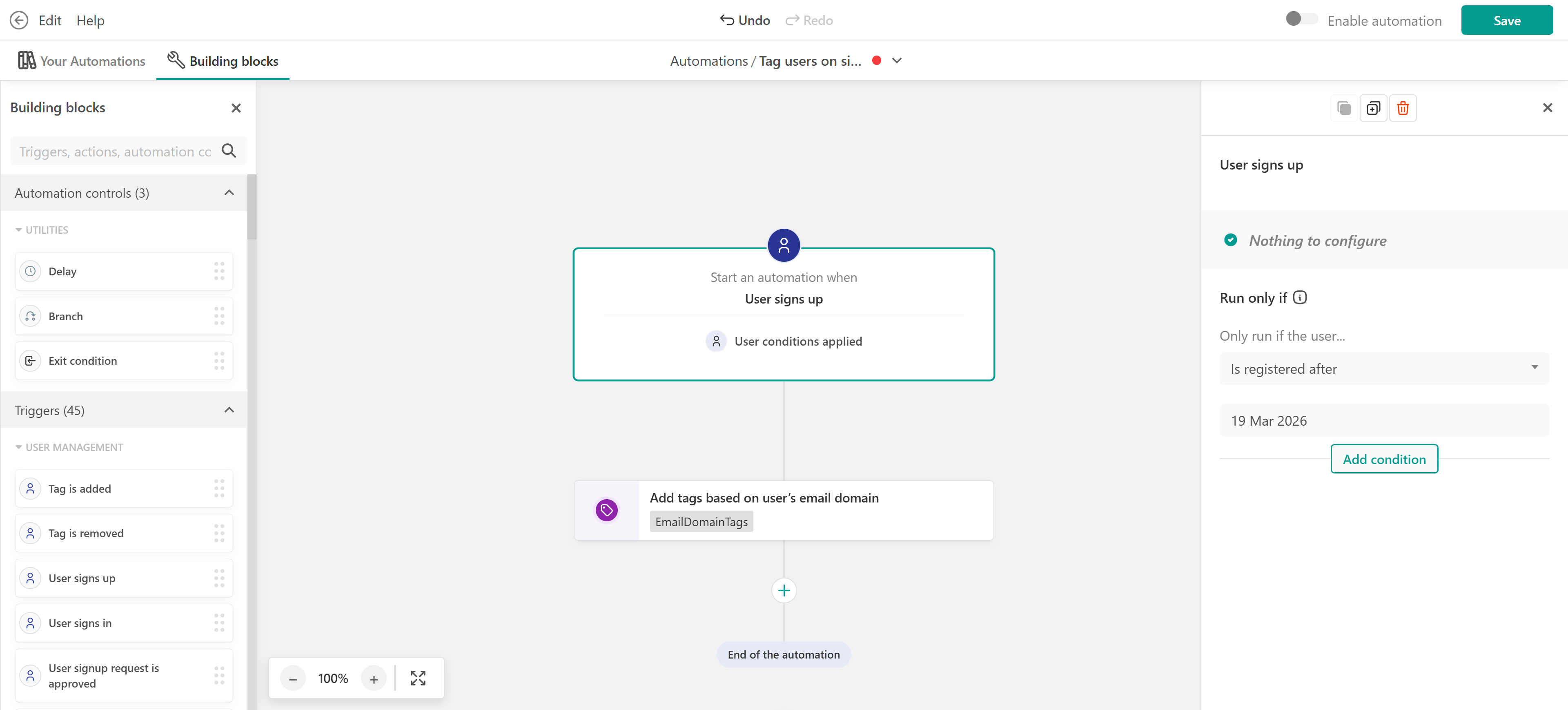 You can use the premade template “Tag users on signup” or customize it further based on your segmentation needs.