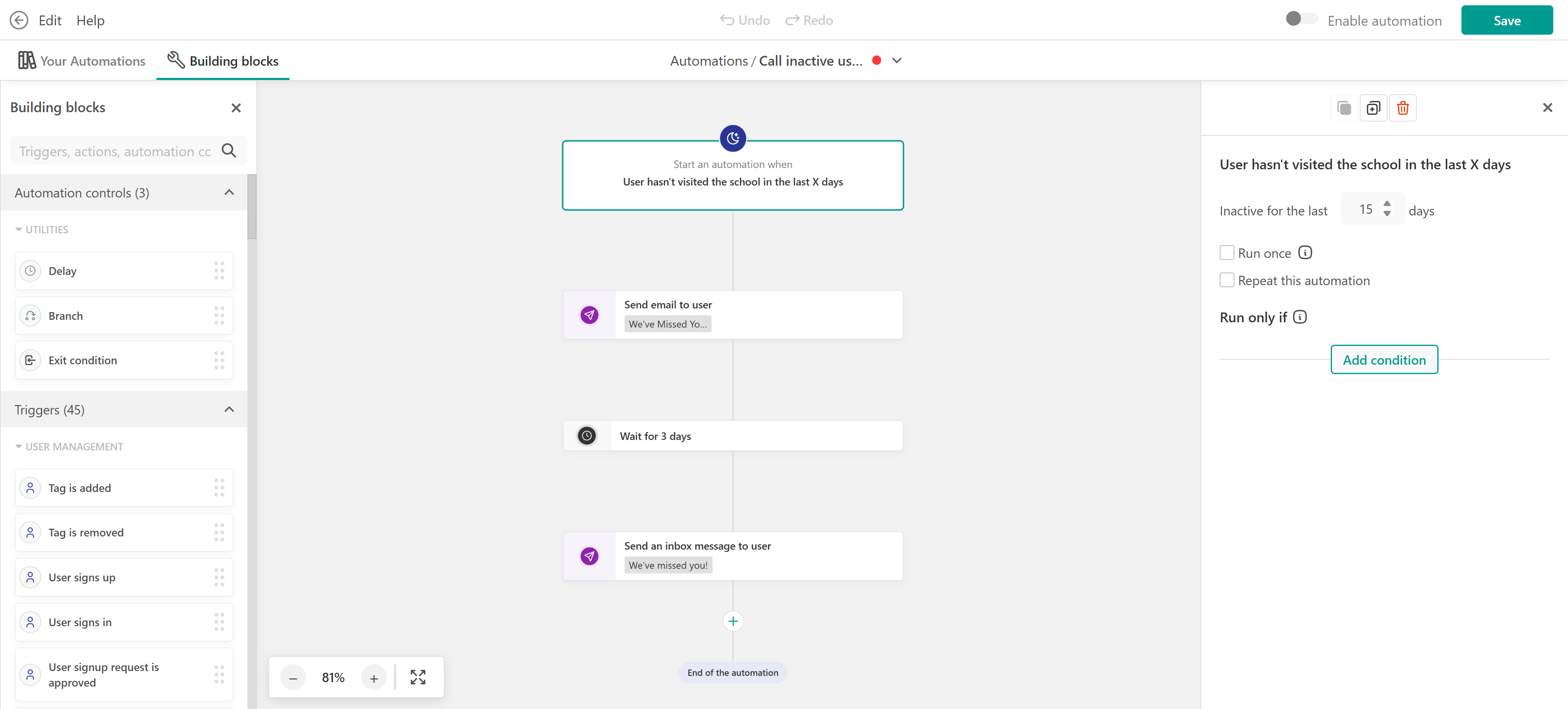 User Automations allow you to automate actions based on user behavior in your school. Below are some common use cases to help you get started and understand how automations can support your workflows.
