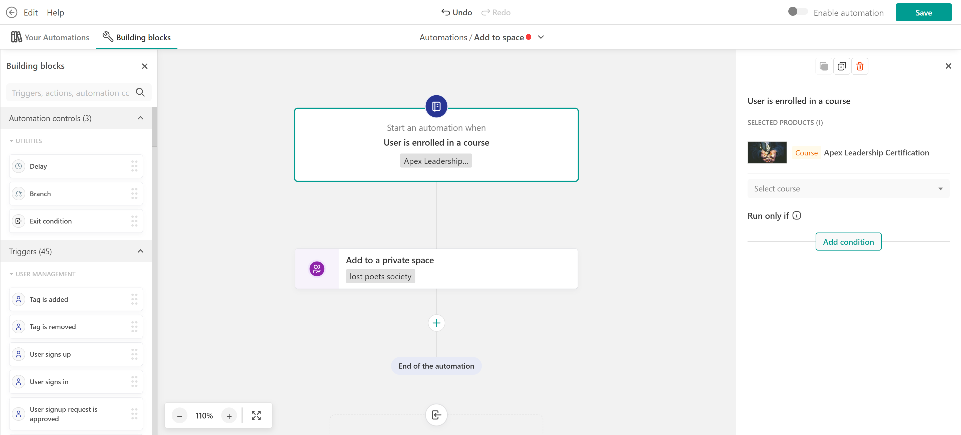 When a user is enrolled in a course, you can automatically add them to a private space in your community. This is a great way to give learners access to discussions, updates, or peer interaction related to that course. The automation could be: