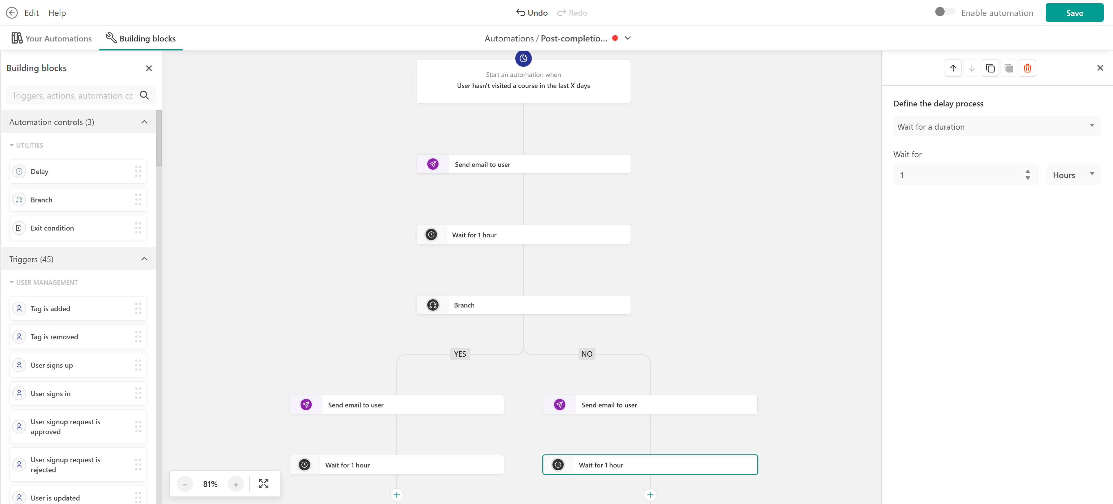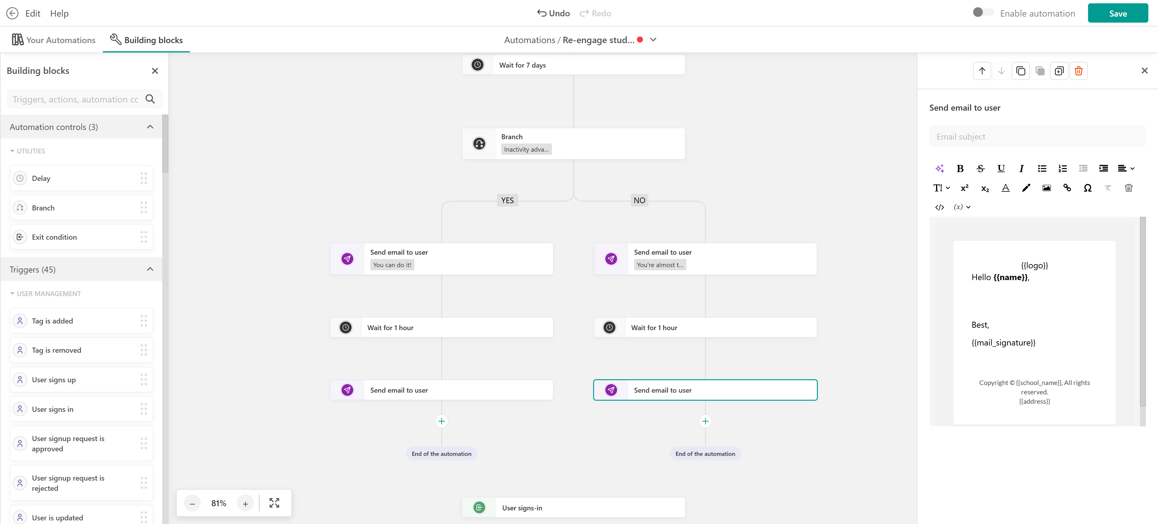 - Exit condition: Stop the automation if the user completes the course or signs-in
