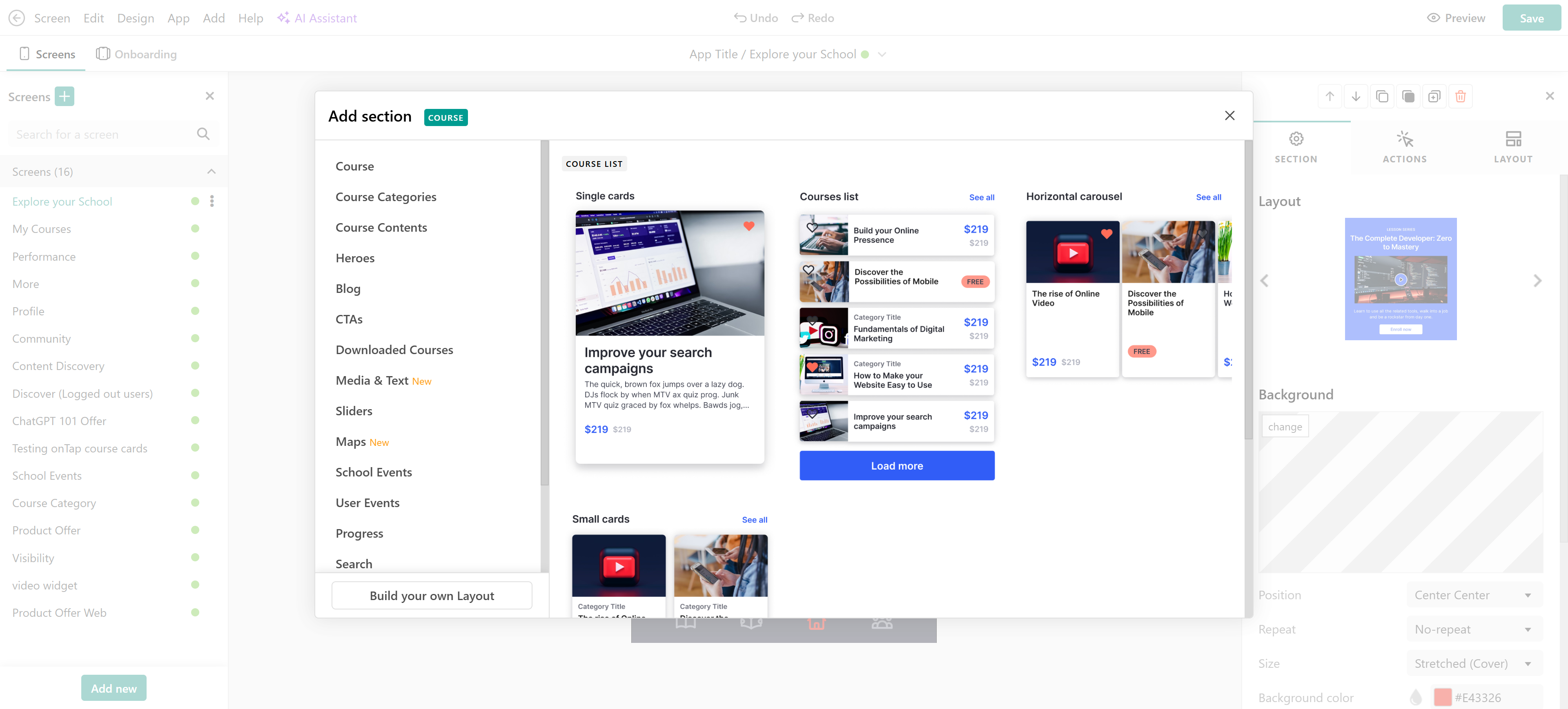 → Section Layout: You can change the layout and choose the number of displayed cards.