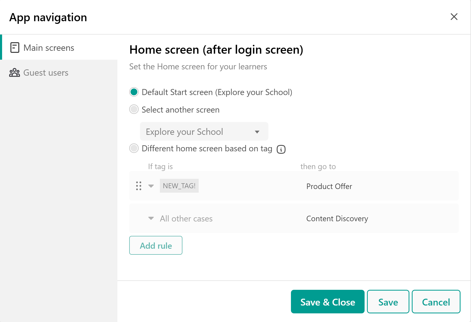 - Under Main screens, you can select the Home screen for your learners, or you can use different home screens based on user tags to create unique home screens tailored to their needs.