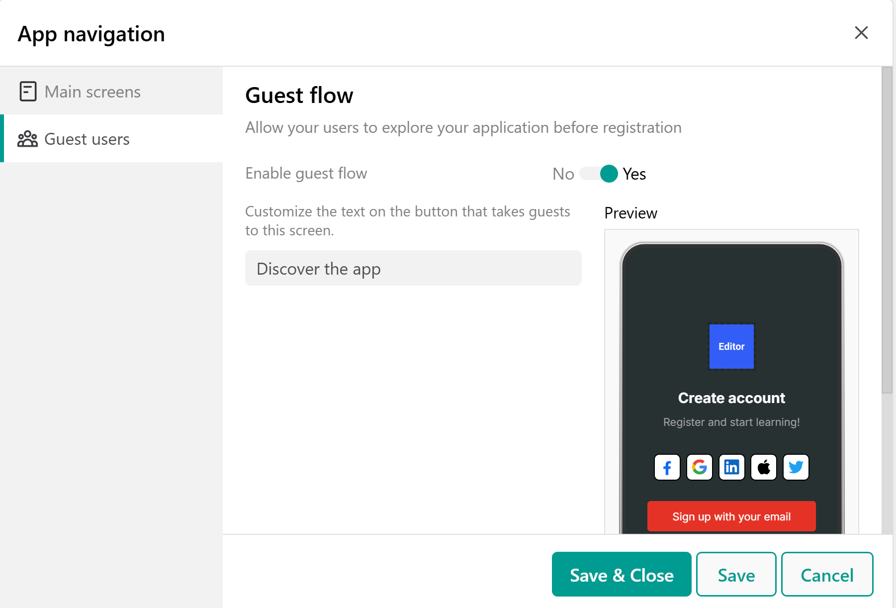 - Under Guest Users, you enable or disable the guest flow and customize the text on the button that takes guests to this screen.