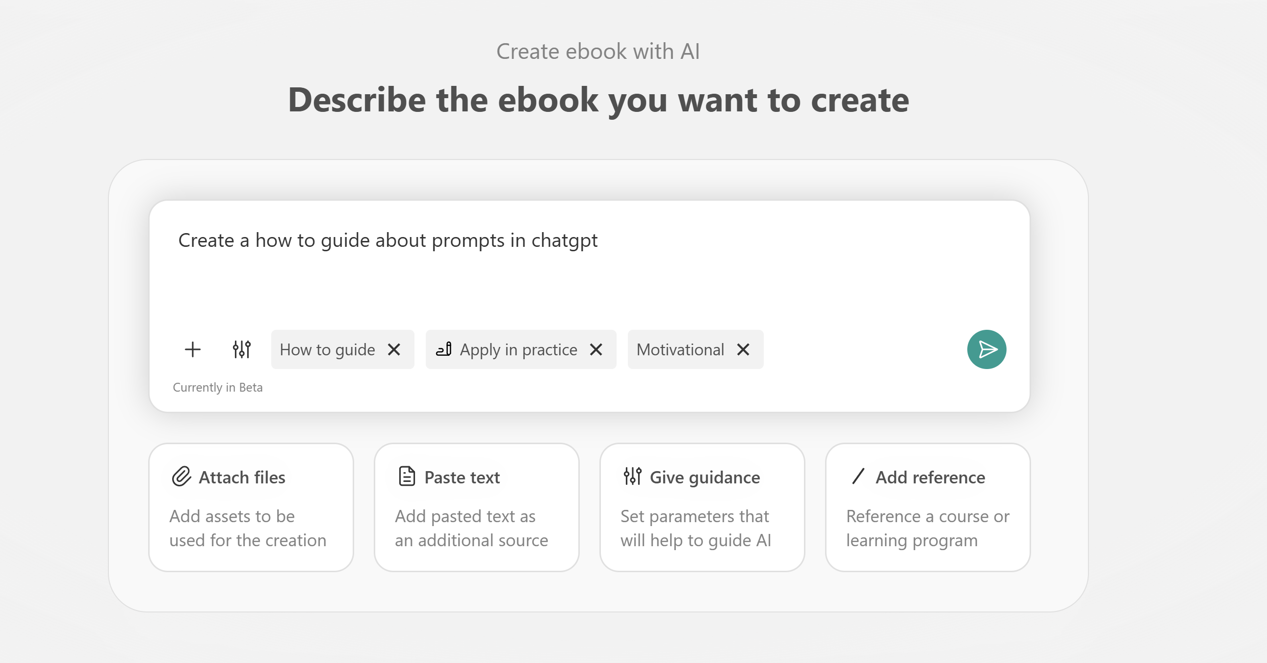A chat box will open where you can describe what your eBook should be about (e.g., topic, chapter idea). You can also