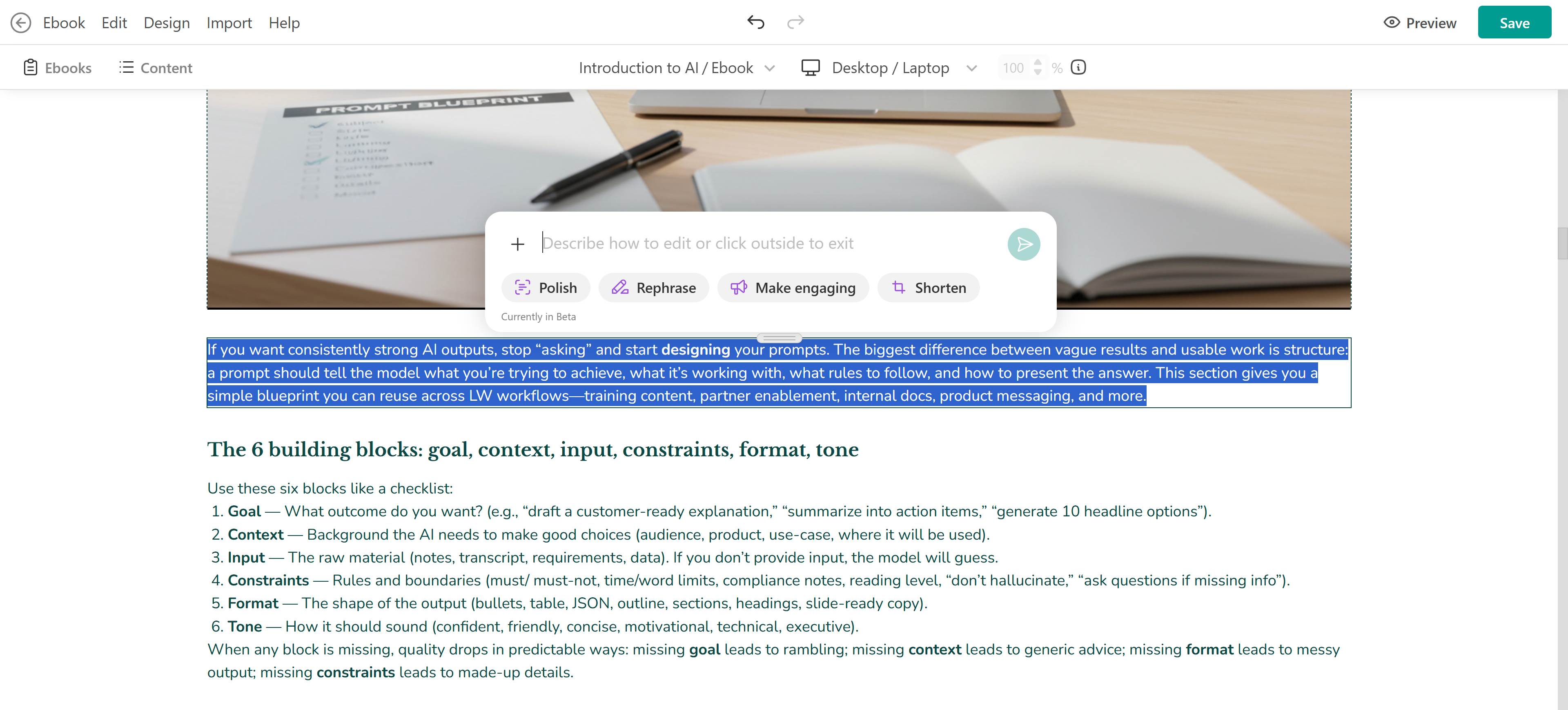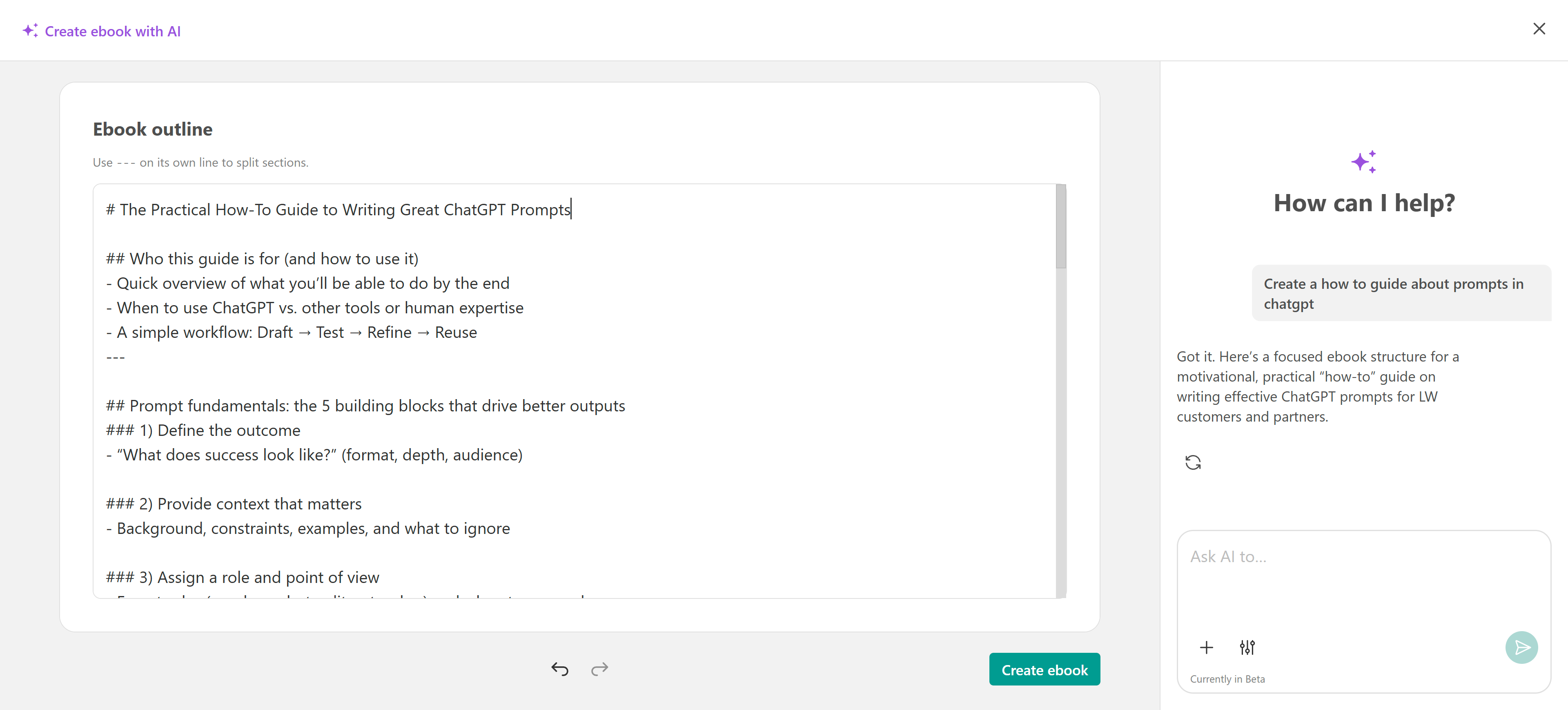 Your eBook outline will appear, ready for review. You can edit it directly by adding or removing content. You can also use chat to refine the result with additional prompts. Once you’re satisfied, click Create eBook to insert the content.