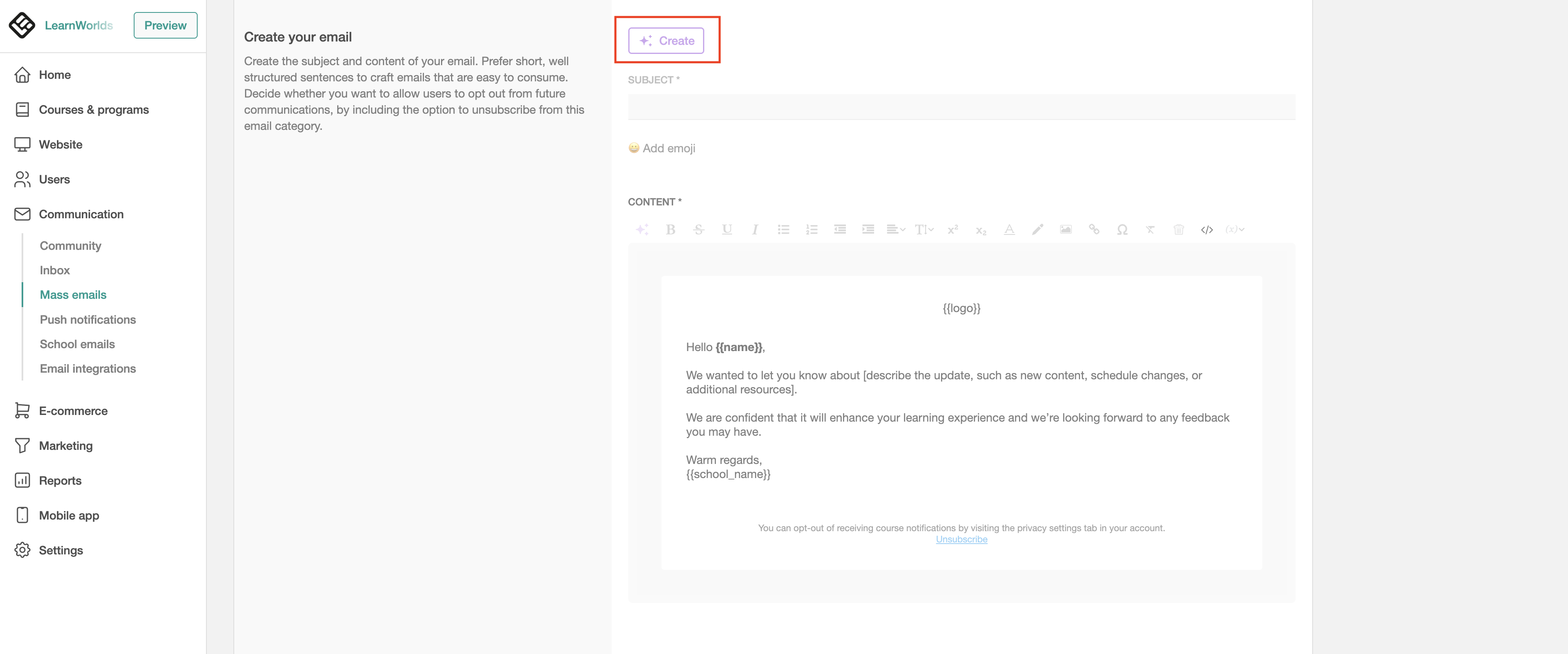 In LearnWorlds, you can use the mass emails feature to send emails in bulk to your users directly from your LearnWorlds School. This tool simplifies the process of applying specific filters and targeting a large group of users who meet the defined criteria.