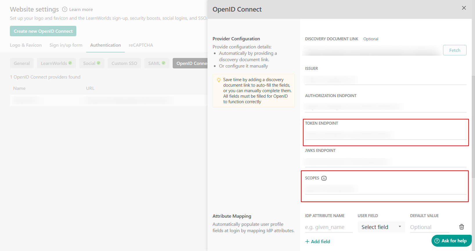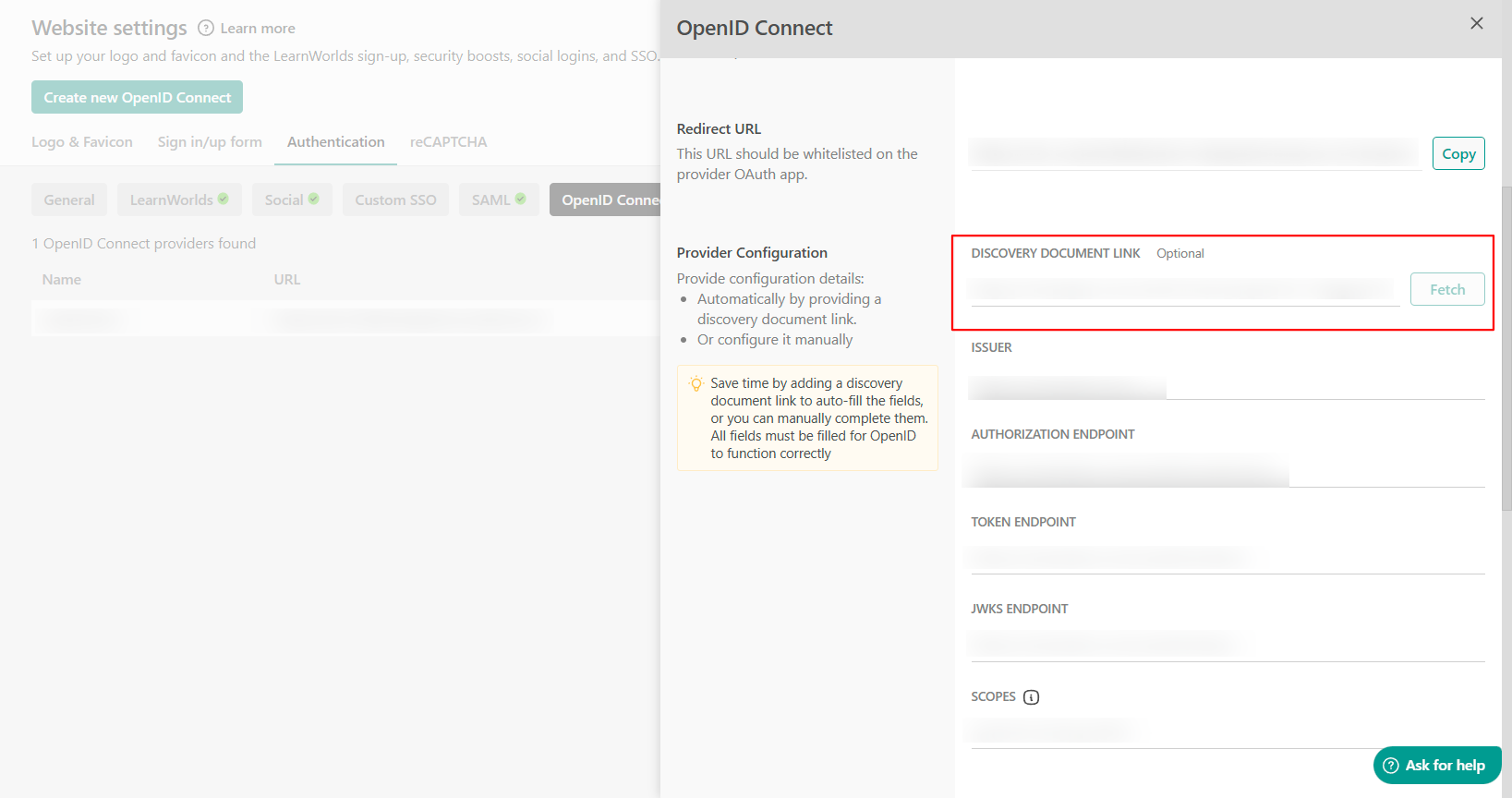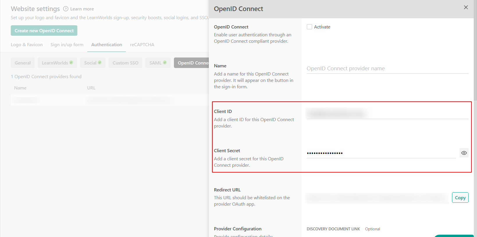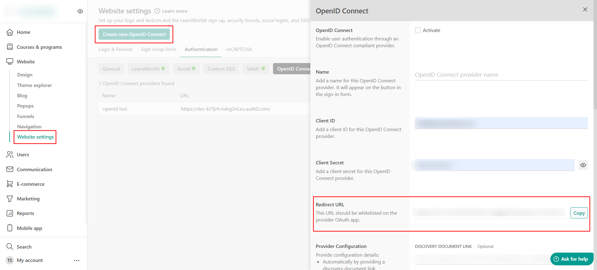 7. Navigate back to your LearnWorlds school under Website Website SettingsAuthentication Open ID connect and create a new OpenID Connect. Locate the Redirect URL and copy it.