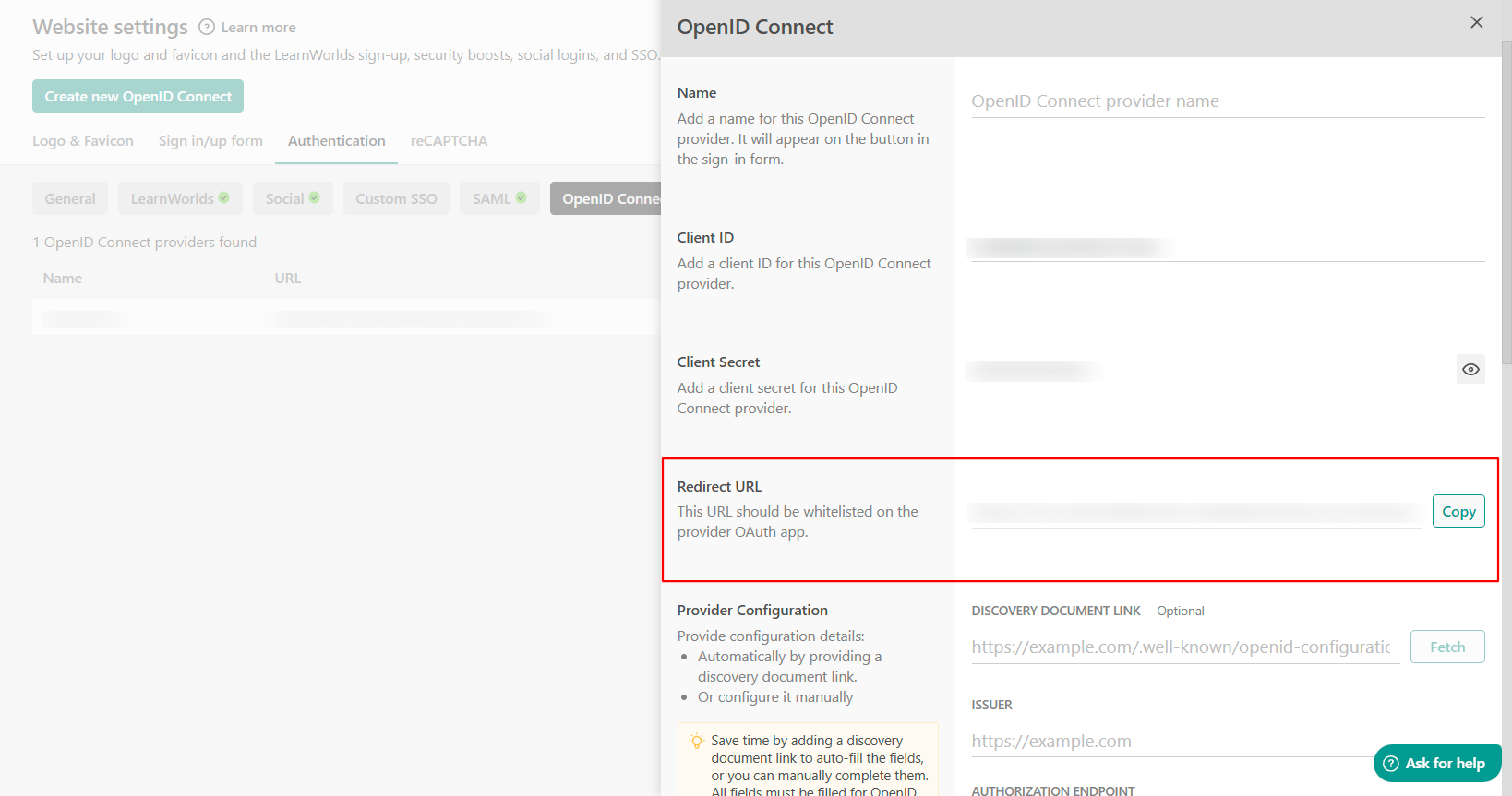 3. Navigate to your LearnWorlds school under Website → Website Settings → Authentication → Open ID Connect and create a new OpenID Connect. Locate the Redirect URL and copy and paste it into your GitLab dashboard under the Redirect URLs field.