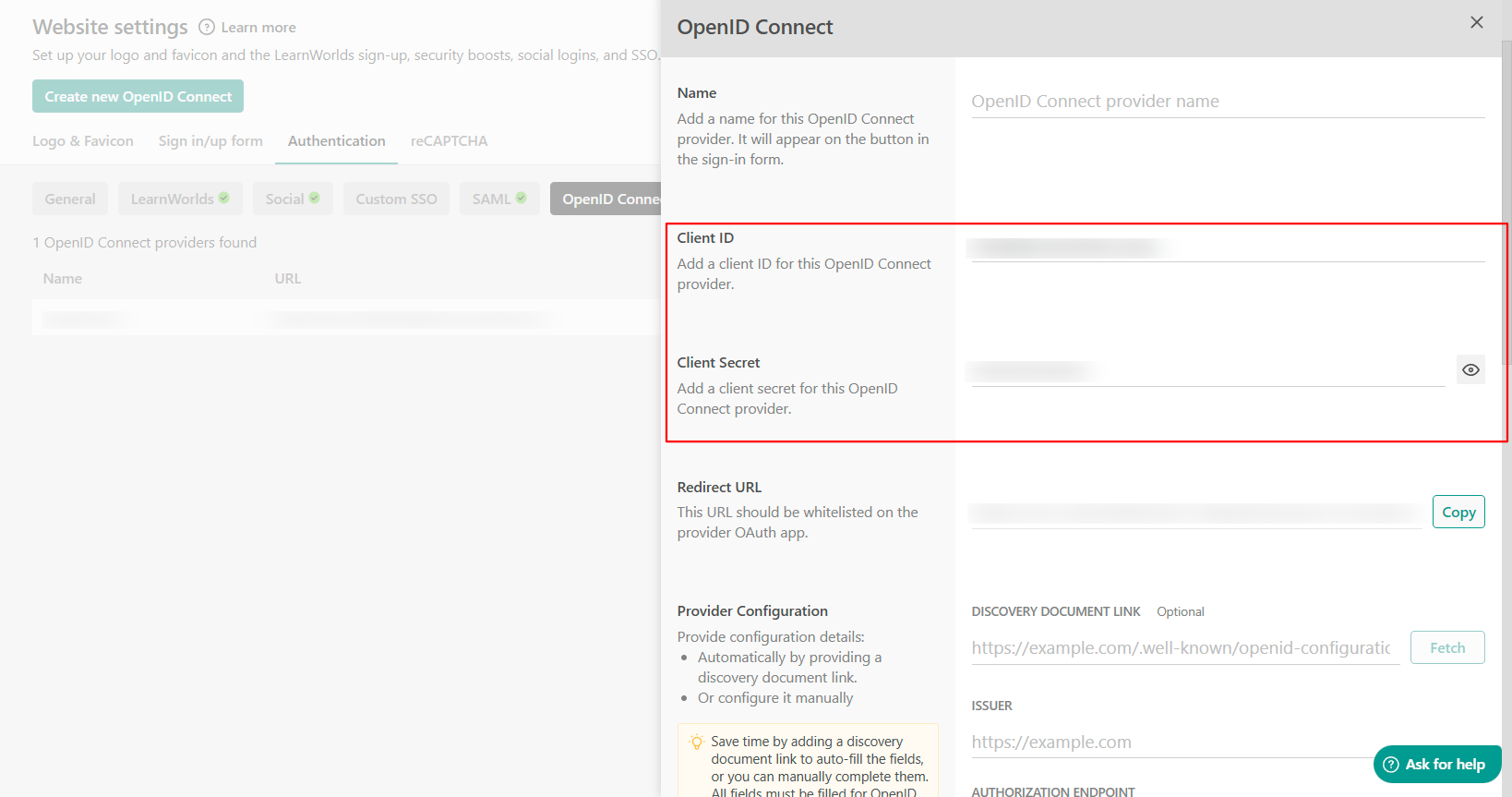 Navigate to your LearnWorlds school under Website → Website Settings → Authentication → Open ID connect you created before. Locate the Client ID and Secret ID fields and paste the respective Client ID and Secret ID keys.