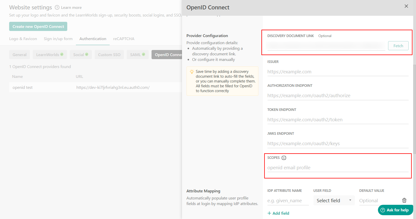 6. Copy the provided link: https://gitlab.com/.well-known/openid-configuration, paste it into the Discovery Document link field in your LearnWorlds school, and click the Fetch button. Then, keep only the following scopes from the discovery document: openid profile email ensuring each scope is separated by a space.
