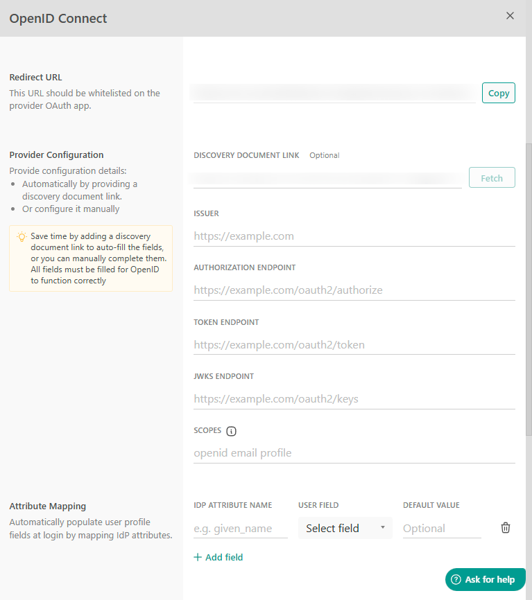- Provider Configuration: You can either automatically provide configuration details by supplying a discovery document link, or configure them manually. Ensure that the scopes openid, profile, and email are included in the scopes section.