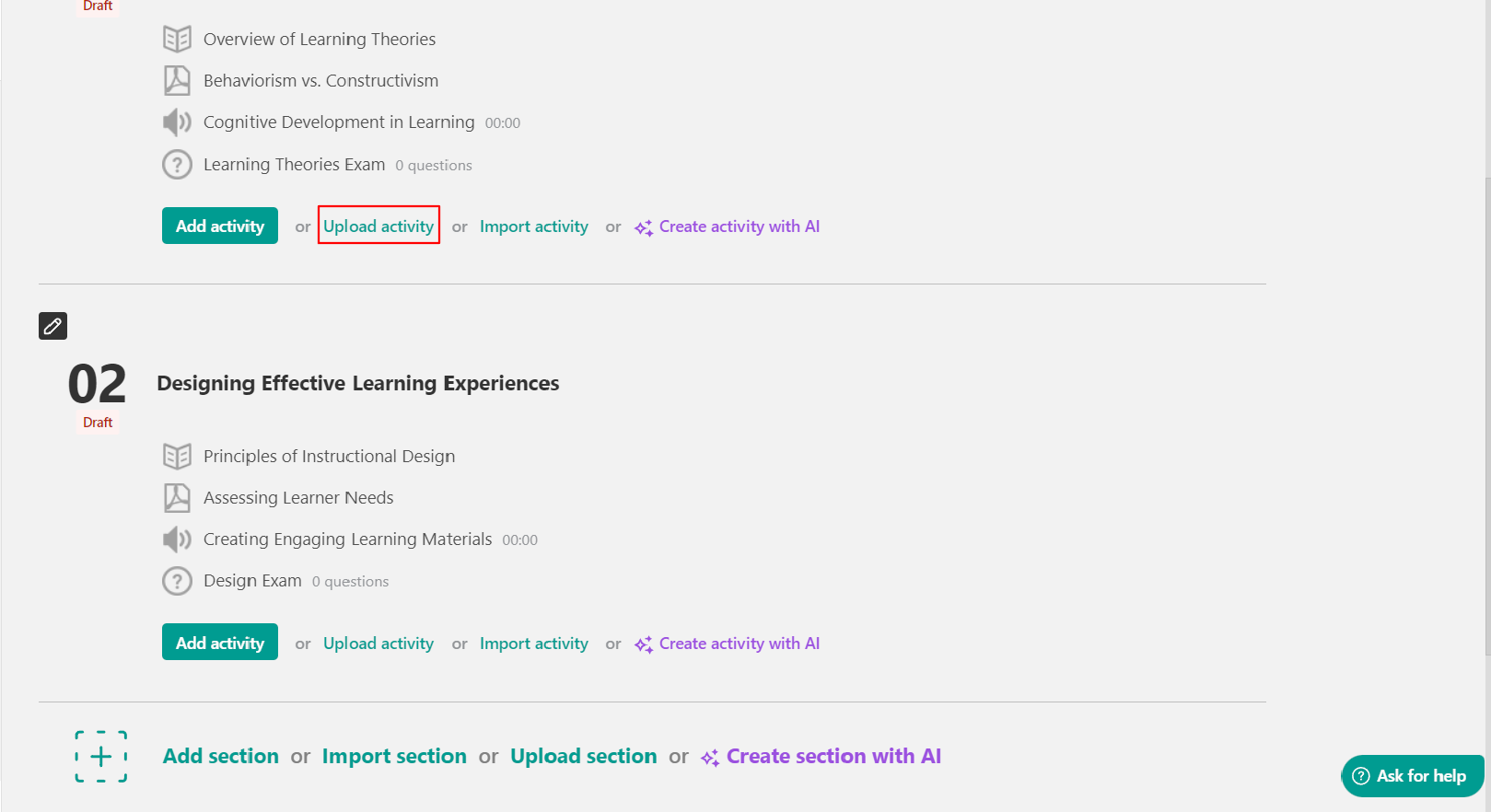 Click the Upload button to begin adding your content. Upload a ZIP file containing all your materials (e.g., Word documents, videos), and the system will automatically create sections and activities for you based on the file types. Zip files can be up to 5GB.