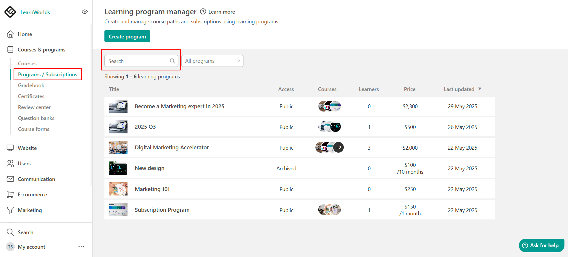 To find the Learning Program Manager, go to the left-side menu and click Courses & Programs → Programs/ Subscriptions.