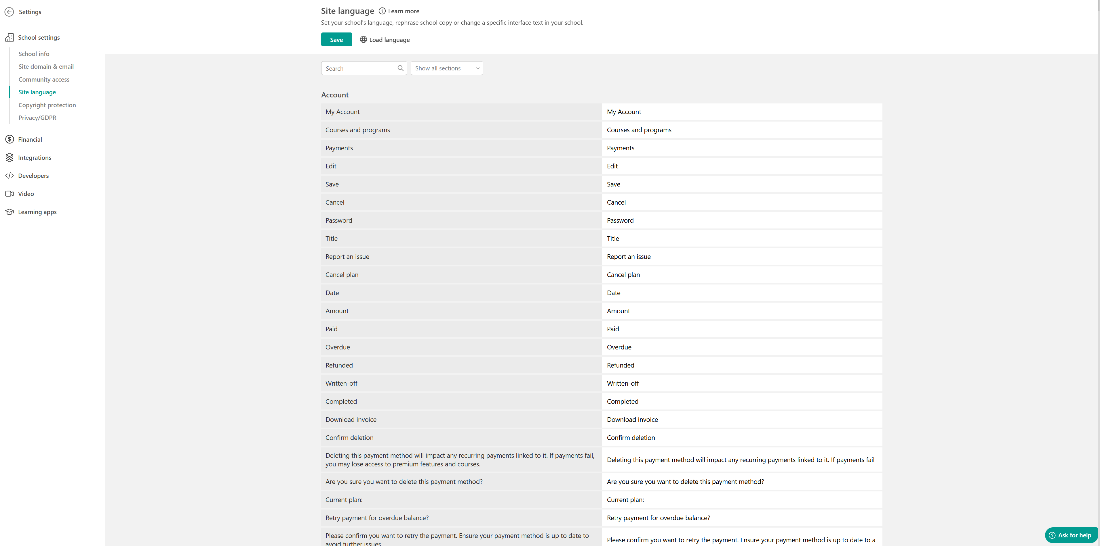 Choose the default language that your learners will see across the platform interface. Go to Settings → School Settings → Site Language.