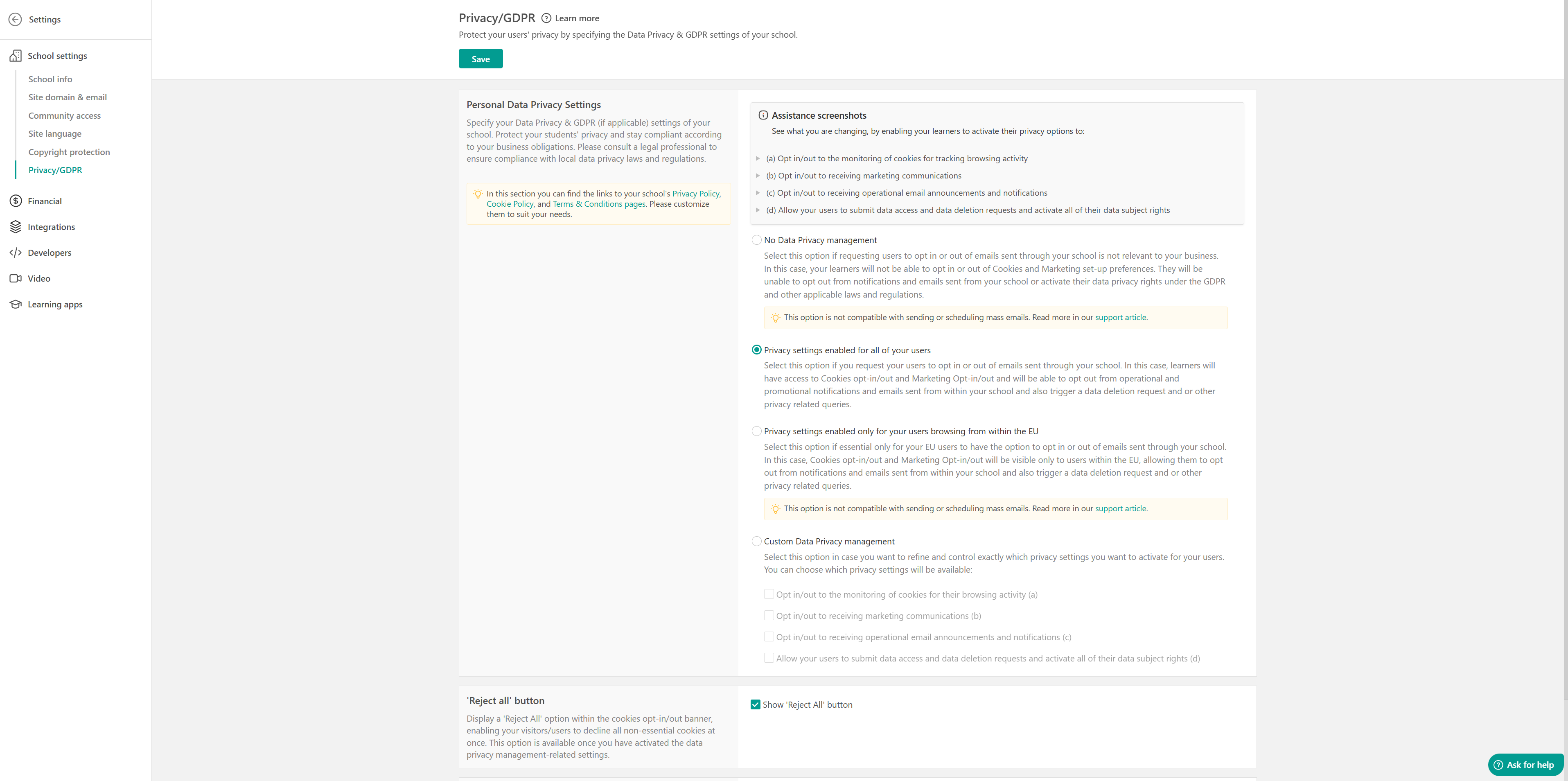 Protect your learners’ data and stay compliant with privacy regulations like the GDPR. Go to Settings → School Settings → Privacy / GDPR.