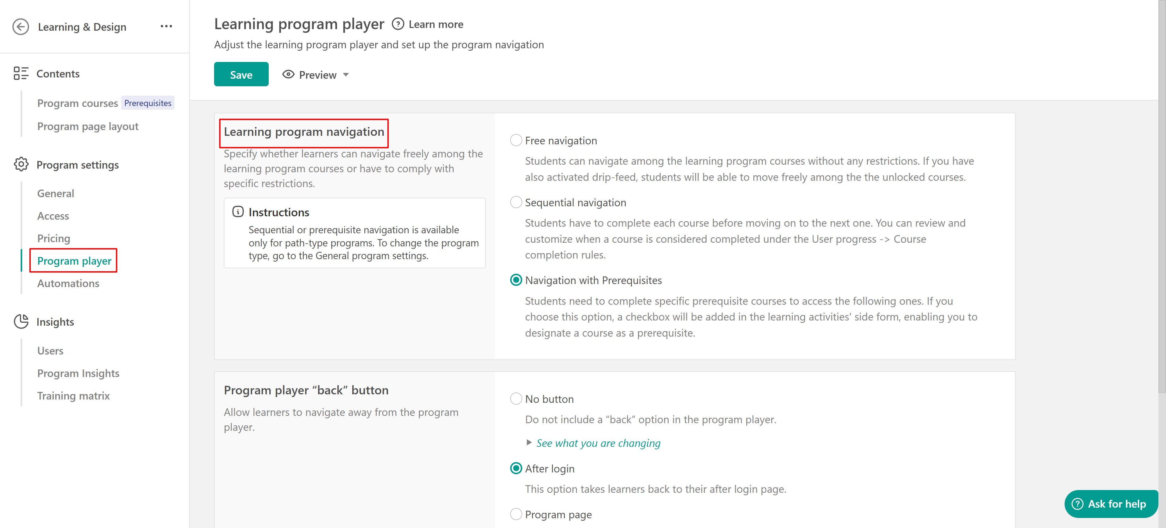 4. Open the Program Player setting to customize the program’s navigation.