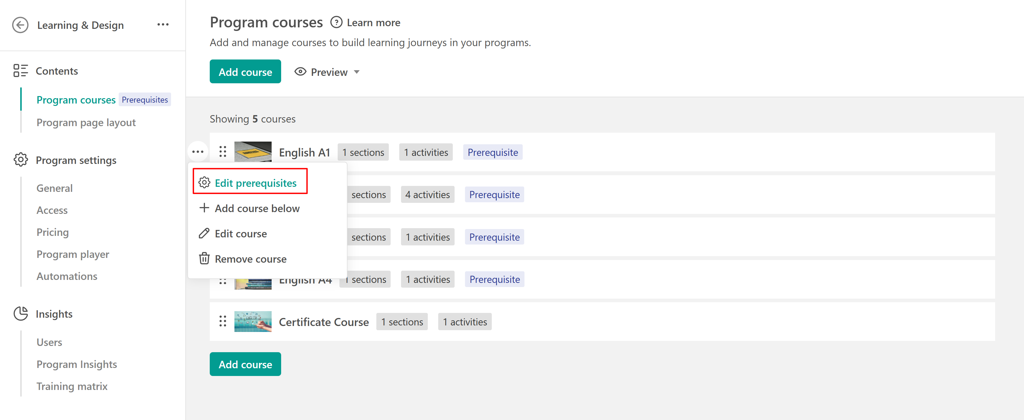 5. Go back to the Program Courses tab. Here, you can reorder courses (if you are using Sequential Navigation) and decide which ones should be set as prerequisites (if you are using Navigation with Prerequisites).