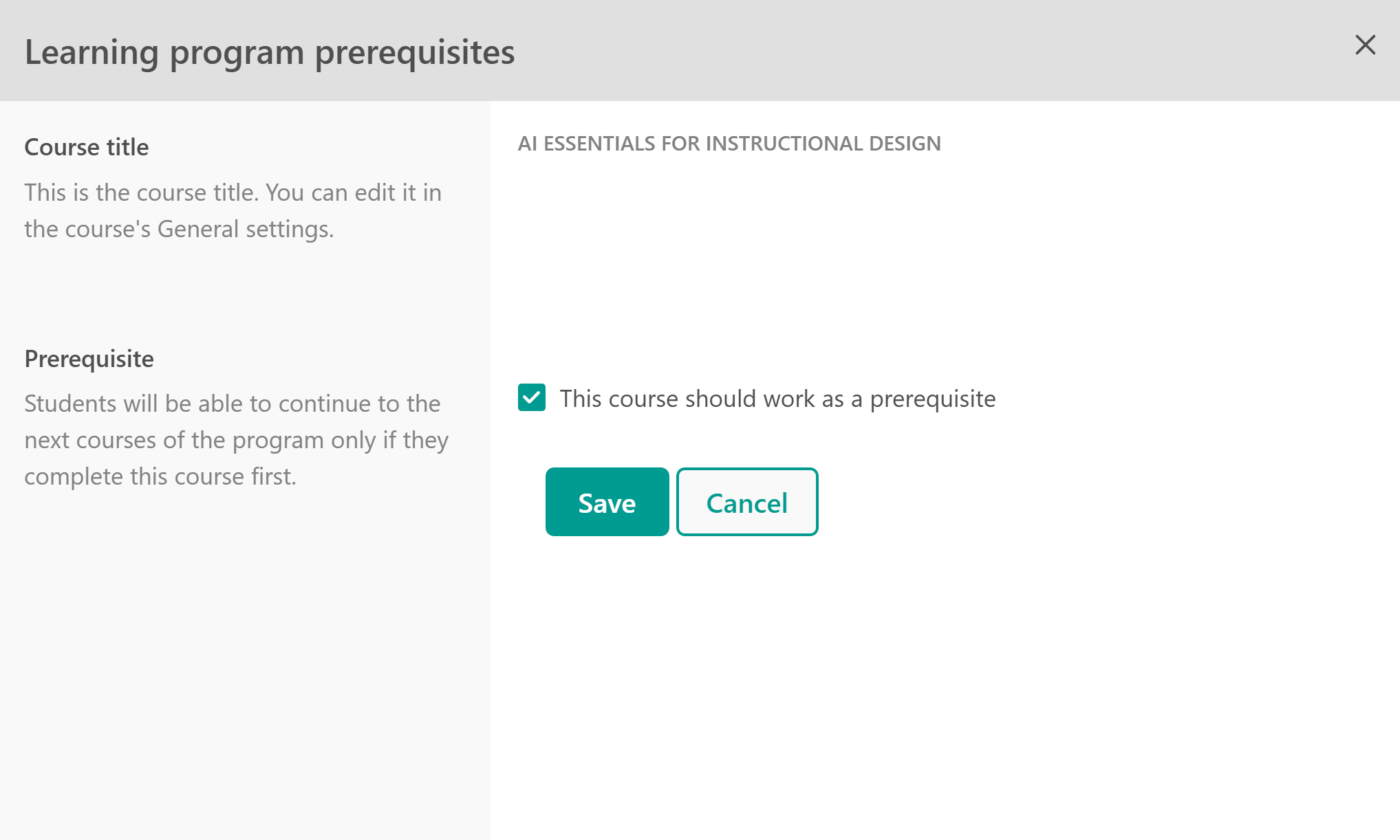 For the Navigation with Prerequisites option, enable the “This course should work as a prerequisite” setting and hit save.